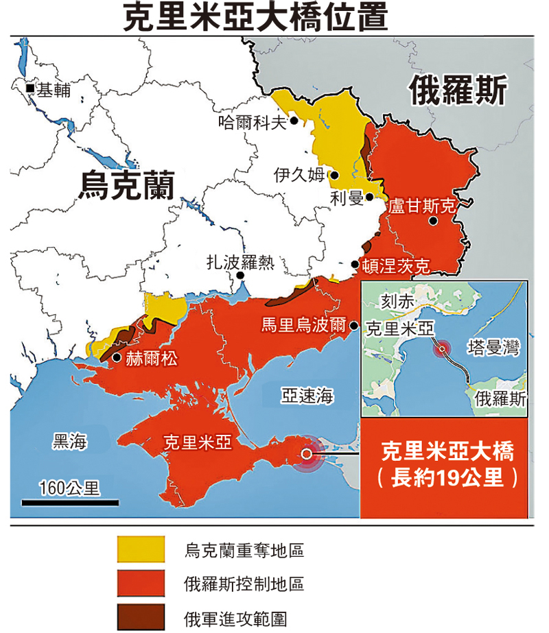 連接俄羅斯克里米亞半島與俄本土的克里米亞大橋,昨日早上發生猛烈爆炸,導致部分橋面坍塌,造成3人死亡,當局隨即關閉大橋。克里米亞當局昨日稍後稱,大橋已重新局部開放予汽車和火車通過,但完成維修需時。由於大橋是俄國向在烏克蘭南部的俄軍運送補給物質的主要路線,大橋交通受阻意味將阻礙補給線,或影響俄軍作戰部署。俄當局指爆炸是卡車炸彈引發,烏總統辦公室顧問波多利亞克事發後稱「克里米亞大橋只是開始」,俄媒指這等同承認是烏方策劃今次襲擊,俄總統普京已下令徹查事件。