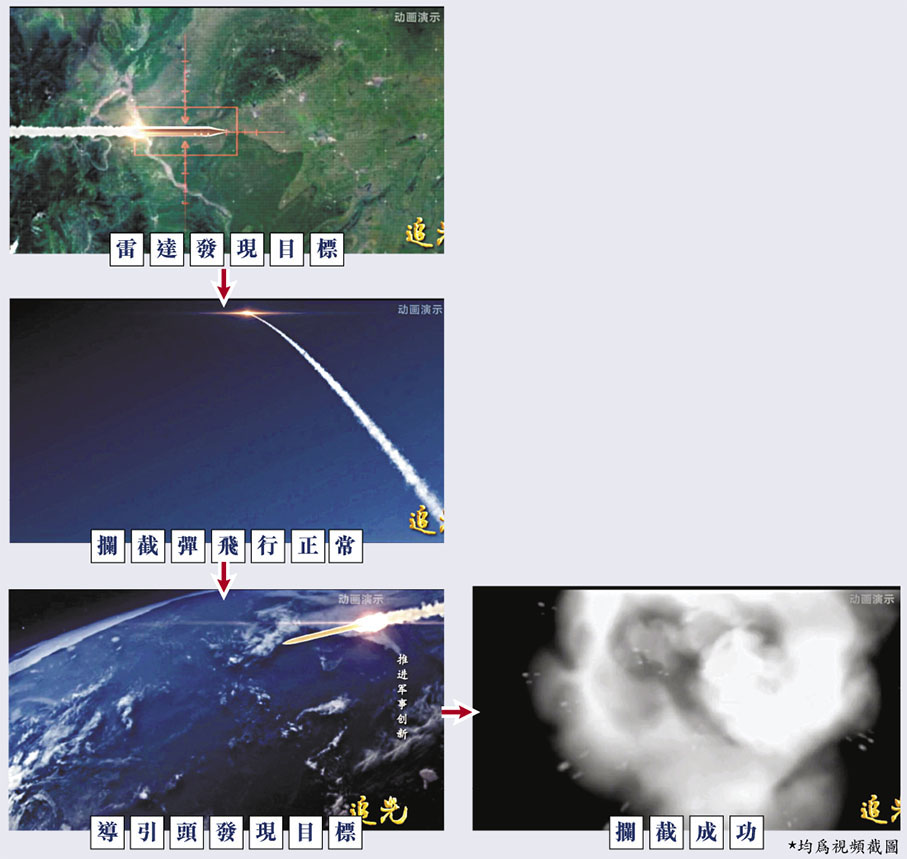 (香港文匯報記者 葛沖 北京報道)解放軍陸基中段反導攔截試驗畫面首次披露。中國人民解放軍新聞傳播中心官方微博(@中國軍號)10月8日在網上公布了一段約20秒的視頻,首度披露了解放軍陸基中段反導攔截試驗命中目標等一連串精彩畫面。視頻最後稱,記者從國防部獲悉,中國在境內進行了一次陸基中段反導攔截技術試驗,試驗達到了預期目的。有專家認為,這顯示中國已具備可靠的陸基中段反導能力,並且應該已經達到了可以實戰應用的水平。