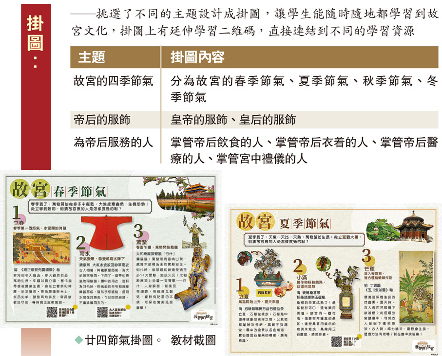他舉例,教材中的「故宮的四季節氣」主題掛圖,不僅讓學生藉故宮的人、事、物等認識中國傳統廿四節氣的概念和基本知識,更能使學生了解到,中國很早便有了自己一套精準的天文學和曆法系統,廿四節氣便是其中一個中華傳統智慧的象徵,從而提升了學生的文化自信和民族身份認同感。