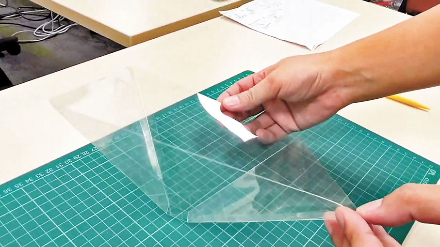 網上專頁提供了紙樣,教師學生可根據相關教學短片和圖示,一起動手依指示剪裁和摺疊膠片,拼成四角立體梯形並用膠紙貼好後,就可放於平板電腦或智能電話上播放影片,再把燈關上,藉膠片折射組成的全息投影影像,就如同讓國寶栩栩如生地呈現眼前。