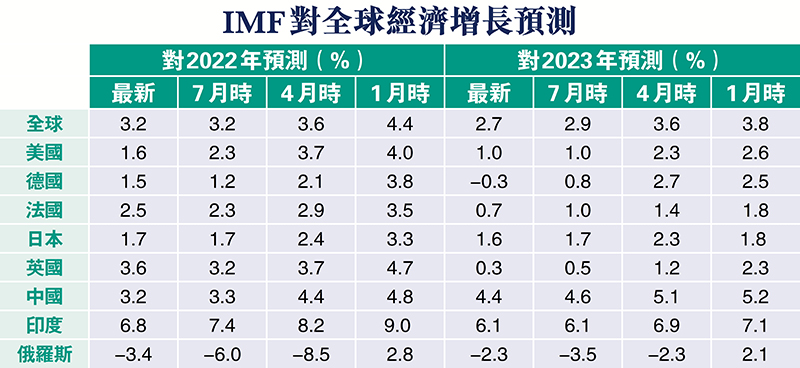 IMF在《世界經濟展望報告》預計,全球經濟增長率預計會從2021年的6%,降至2022年的3.2%和2023年的2.7%,前者與7月預測值持平,後者則較7月預測值下調0.2個百分點。報告解釋指,當前全球經濟活動普遍放緩,且比預期更嚴重。通脹正處幾十年來高位、多數地區金融環境不斷轉差、烏克蘭危機及新冠疫情持續等,都對全球經濟造成嚴重影響。