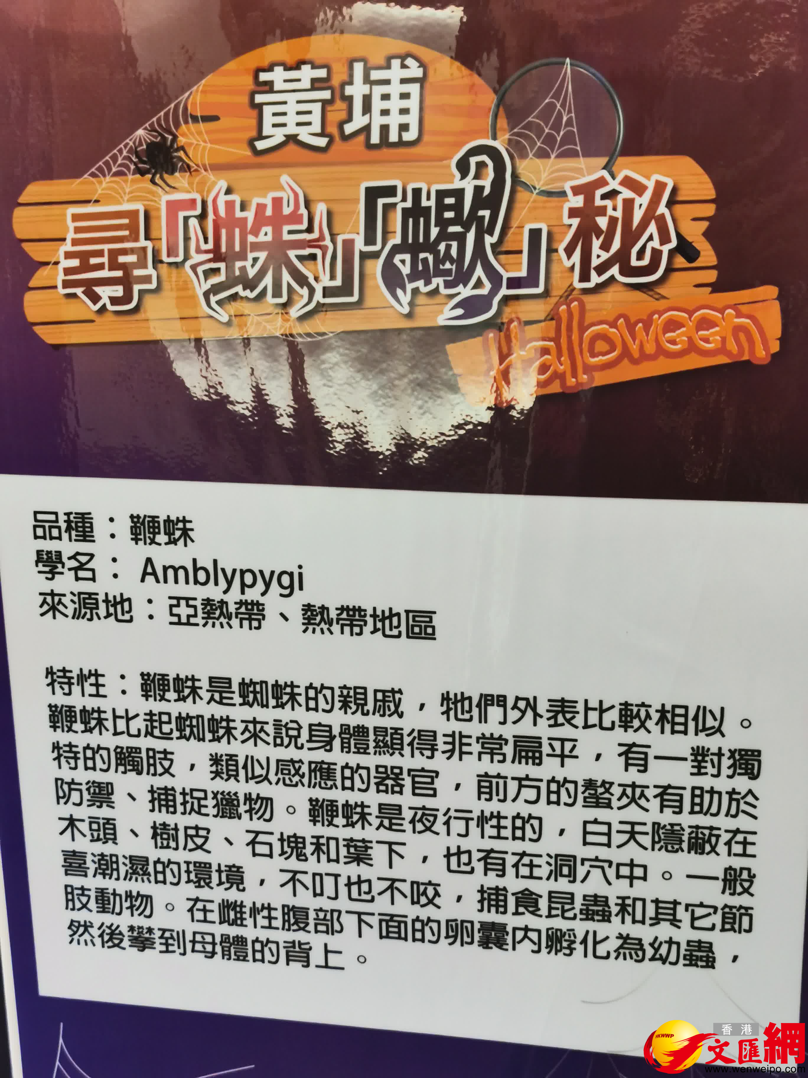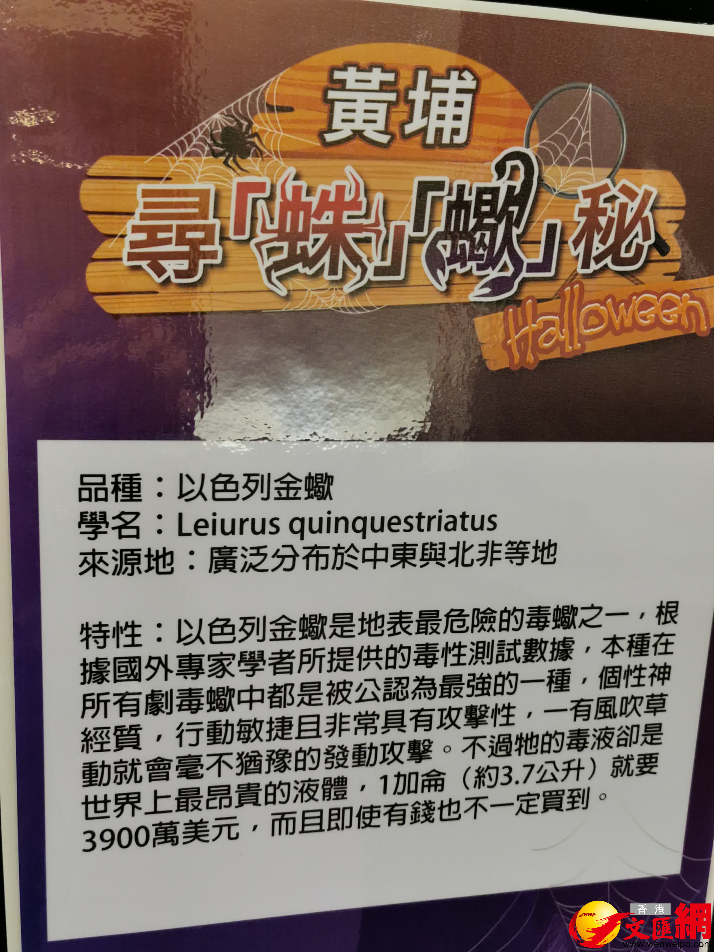 (香港文匯報記者 雨文)萬聖節除了女巫嘩鬼及南瓜之外,曝光度高的必屬蜘蛛和蠍子。今個萬聖節,紅磡黃埔天地將於10月22至30日周末期間呈獻「尋『蛛』『蠍』秘Halloween」,展出多款來自世界各地不同稀有品種的蜘蛛及蠍子,為大家帶來一個最「毒」特的體驗。同時,場內亦為大小朋友準備「萬聖DIY工作坊」,親手製作嘩鬼手偶及南瓜燈籠;而一班萬聖嘩鬼更會神秘遊走黃埔天地各期商場並沿途大派糖果,齊齊感受一個熱鬧的萬聖節!