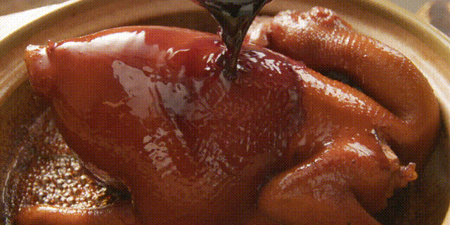 將雞殺洗乾淨,吊乾水份,用少份薑蔥、醬油醃10-15分鐘;將瓦煲燒熱,放油、蔥、薑、500克兌水的醬油、冰糖調好味後,放入整隻雞,大火燒乾醬汁後調成文火,每10分鐘翻一下雞,共焗40分鐘左右,讓味道吸收,肉質熟透,皮色有光澤即可,最後切塊擺盤。