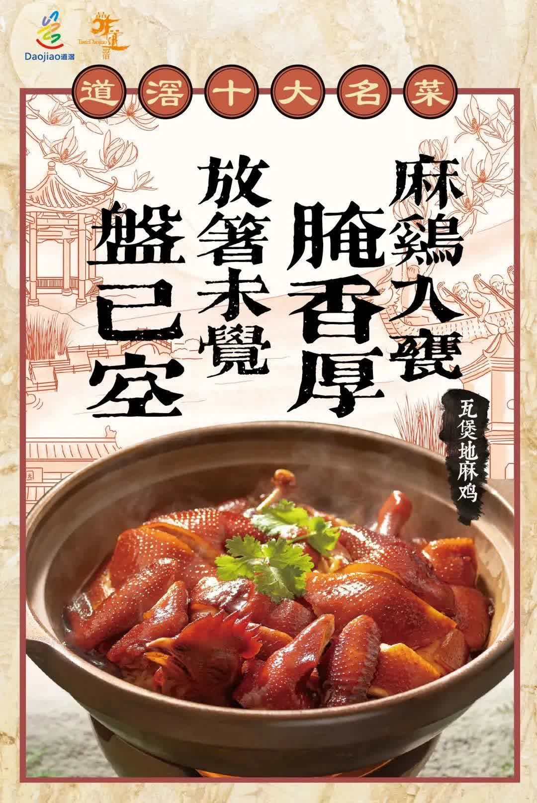 相傳南越王趙佗不但愛吃生猛海鮮,也特別喜歡吃禽類。一次南越王乘船經過東莞一帶時突感腹中饑餓,要求同行隨從立即靠岸備飯。隨從準備不及,心中大驚。他知道南越王對食物頗為挑剔,隨便弄一些尋常吃食自是糊弄不過。於是他趕緊在岸邊找到一個村民,要求他趕緊做出美食獻上,不然就要殺頭。這個村民沒有辦法,只能急中生智將一隻自養的麻雞收拾乾淨,和調料一同放入瓦煲煲熟。沒想到這道菜餚竟肉香四溢,口感嫩滑,連吃慣了山珍海味的趙佗都讚不絕口。後來,瓦煲地麻雞這道特色菜逐漸流傳開來。近年來當地老百姓不斷改良完善,最終成為道滘鎮享譽四方的一道名菜。