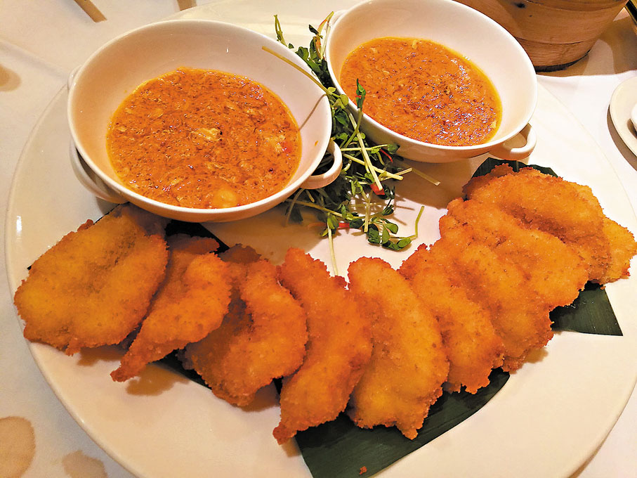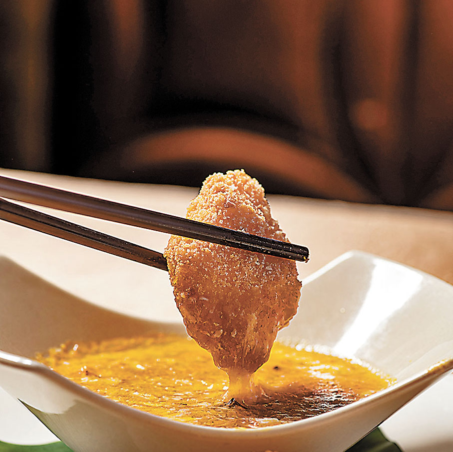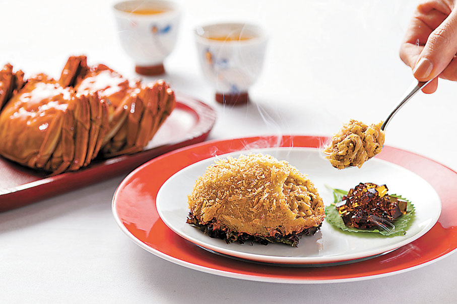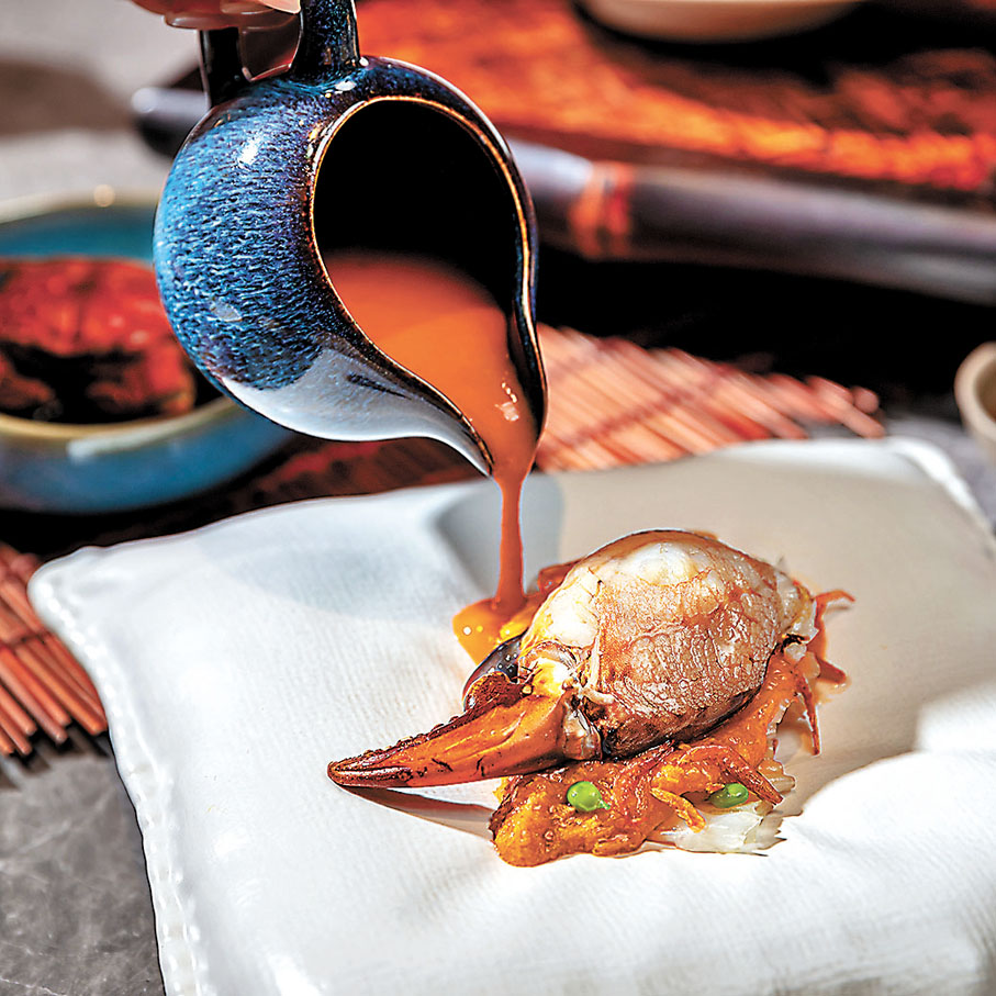 另一主打菜式脆香大閘蟹蓋,師傅先把大閘蟹蟹肉、雞髀菇粒、洋葱和自家製蟹粉炒香,釀入大閘蟹蓋後炸至顏色金黃。在享用蟹蓋時,可加入少許蟹醋啫喱同吃。由於大閘蟹在中醫角度是寒涼帶濕的食物,黃師傅特意採用滋補暖身的羊肉入饌中和屬性,推出黃金蟹粉羊肉脆卷,客人可將香脆可口的羊肉卷蘸點蟹粉醬同吃。而石鍋蟹粉炒絲苗則以青瓜粒、馬蹄粒、洋葱粒、葱花及絲苗炮製,面層鋪滿黃油色彩的蟹粉,並以石鍋熱騰騰上桌,細味大閘蟹的濃濃蟹粉香氣。