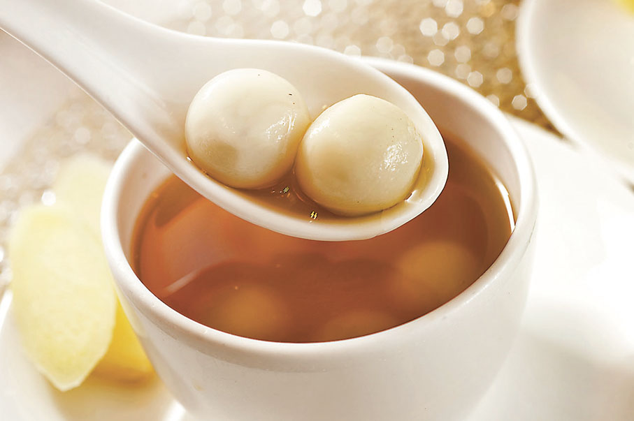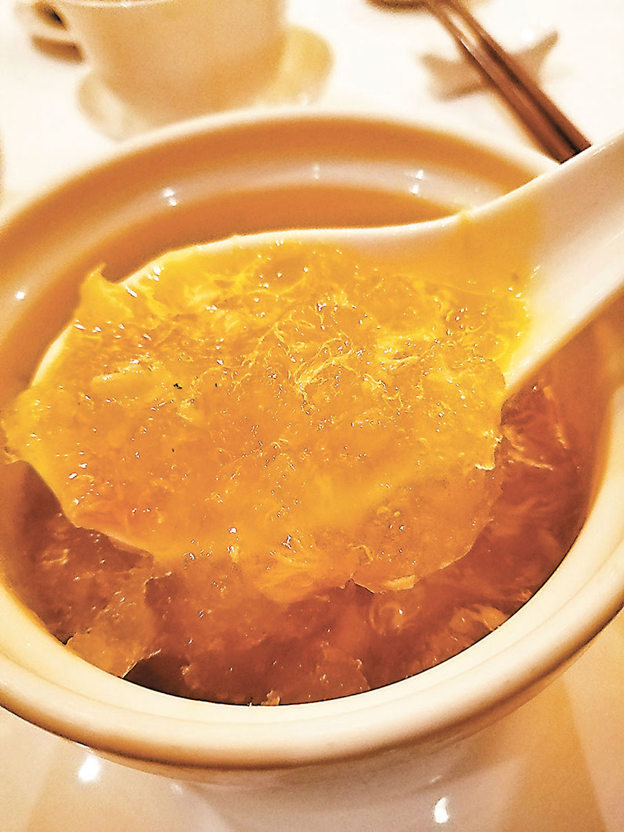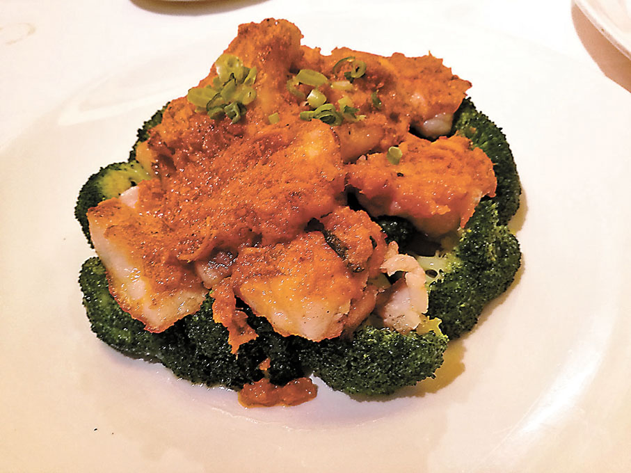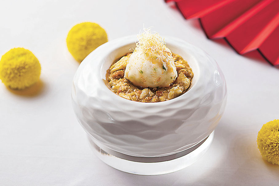 秋天亦是品嘗糯米飯的時候,黃師傅以傳統香煎糯米雞為靈感,創作出這道香煎珍珠糯米鮑伴蟹粉,先將南非十頭鮑魚用糯米包裹後煎至金黃,置放在鮮嫩的菠菜苗上,底層鋪滿甘香美味的蟹粉。芙蓉蟹粉花枝球也是黃師傅別具創意的菜式,他將豆腐加入蝦膠揉成棗狀,再以加入葱花作點綴的花枝包裹成球,配以鮮甜誘人蟹粉及香滑的蛋白同吃。