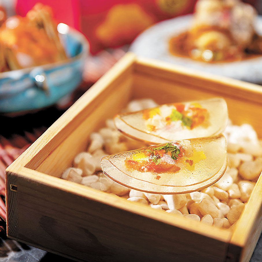 例如,前菜阿拉斯加蟹肉凍,使用吊雞湯的做法,令雞湯凍格外清澈而味濃, 內裏藏阿拉斯加蟹肉,冷藏後凝固成啫喱。松茸焗釀蟹蓋使用雲南松茸,松茸及螃蟹是秋天時令食材,松茸的清香亦能更加凸顯蟹的鮮味,再加入金華火腿帶來一點鹹鮮味。芙蓉蟹皇玉蟹鉗使用大肉蟹的蟹鉗,加上「芙蓉」大閘蟹膏,是大閘蟹和肉蟹的匯聚,底部墊了陳村粉,盡吸兩款蟹的精華。至於15年古越龍山糟滷蟹,使用時令靚蟹,或當造大閘蟹,並特別採用古越龍山15年花雕酒及糟滷汁釀製,相比清蒸的做法,味道更為濃郁且鮮甜惹味。