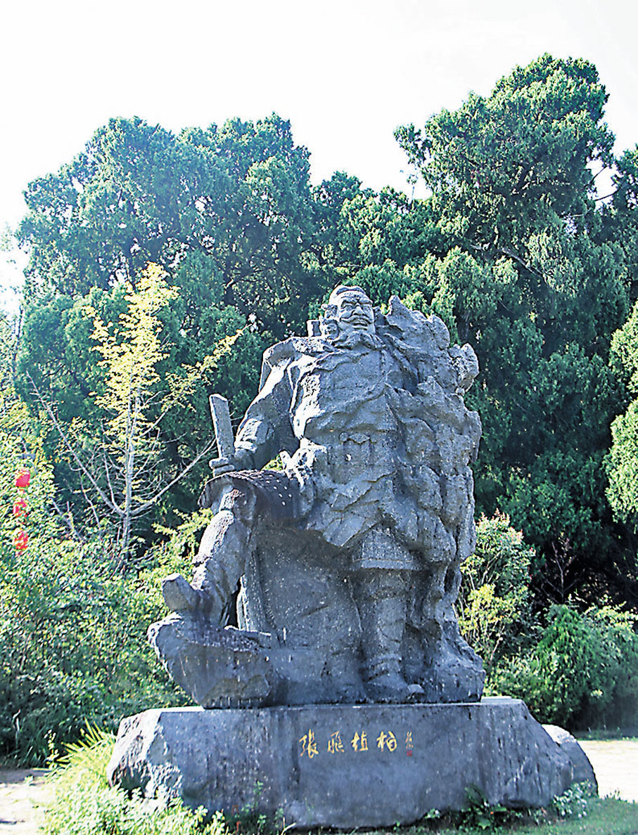 走進「張飛植樹」廣場,只見一座高大的張飛石雕矗立在廣場上。他左腿直立,右腿斜跨,手持長劍,雙目平視前方,張開大大的嘴巴,好似在吆喝正在植樹的士兵。相傳,張飛擔任巴西(閬中)太守時,軍情政務羽書出川頻繁,往往因劍門山勢險峻、道路崎嶇而耽誤。於是,張飛命令士兵自閬中至昭化鑿石開山,將羊腸小道擴建成一丈多寬的石板大道,並在兩旁栽植柏樹。這條柏道不僅利於行軍,還方便了商賈和百姓出行。當地老百姓為紀念他,不僅勒石塑像,還將這片柏林命名為「張飛柏」。