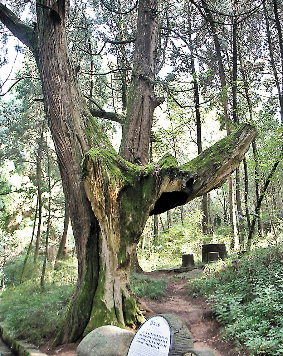 順着一條林蔭小道向山梁上行進,大約10餘分鐘便來到「張飛植樹」廣場,沿着一條石板路往裏走,密集的古柏形態萬千,風姿各異,翠碧連雲。有以長勢命名的「鴛鴦樹」、「姊妹樹」、「羅漢樹」、「觀音樹」,有以粗壯命名的「狀元柏」、「帥大柏」、「壽星樹」,還有以史典命名的「阿斗柏」、「望鄉柏」、「石牛樹」等,真是「千姿萬態羞雷同」。
