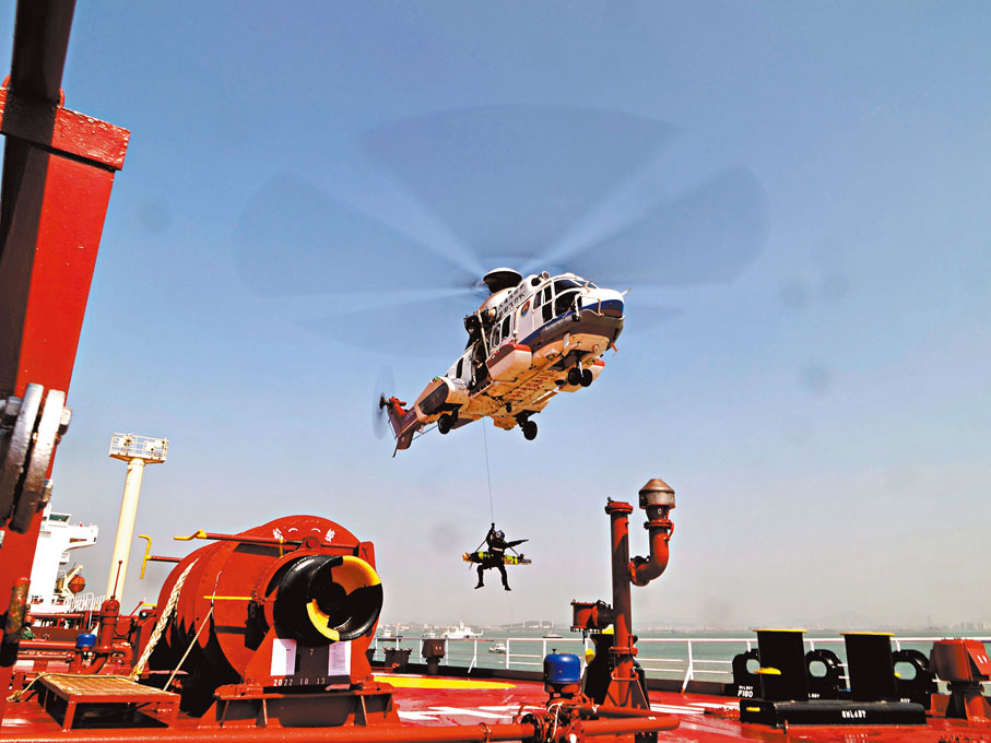 香港救助直升機從香港飛到模擬事故海域協助救援,直升機在海面盤旋掀起了一層層向外擴散的圓圈波紋。在內地無人船的指引下,香港救助直升機的工作人員沿着繩索緩緩靠近海面,抱起了落水人員,沿着繩索回到直升機上,全程乾脆利落。