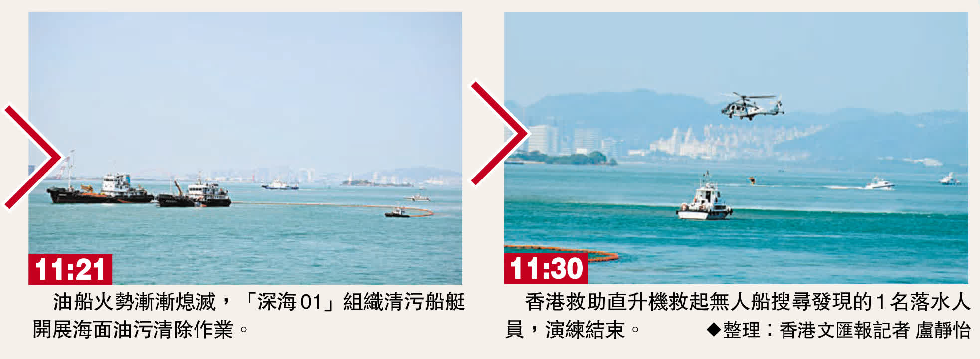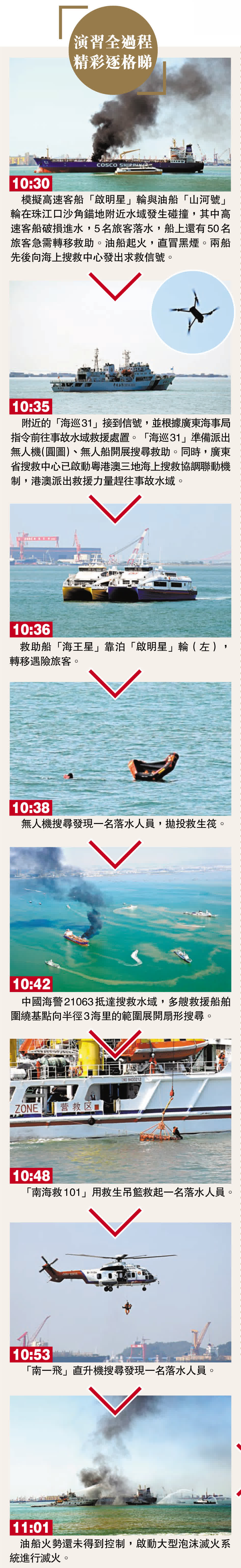 (香港文匯報記者 盧靜怡 廣州報道)「演練開始!」總指揮一聲令下,模擬油船和客船發生碰撞,不一會便濃煙滾滾。事故船隻發出求救信號後,海上搜救中心快速調度各方救援力量,將險情通報香港海上救援協調中心和澳門特區政府海事及水務局。這是10月27日在珠江口水域進行的2022年國家海上搜救綜合演練的一幕。這次演練中,粵港澳三地共出動20家單位、28艘船艇、3架飛機、500餘人參與,中國首艘萬噸級海事巡邏船「海巡09」輪首次在國家級演練中亮相。中國海上搜救中心相關負責人認為,此次演練將增強粵港澳大灣區海上搜救力量協調配合、綜合實戰能力。