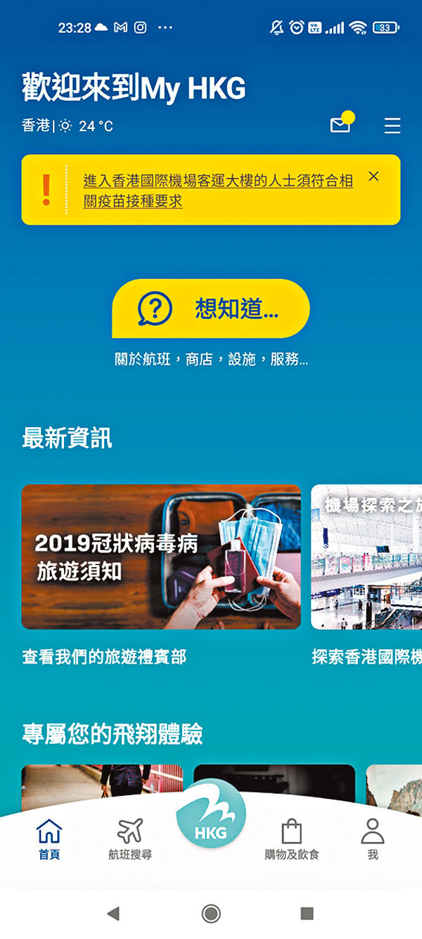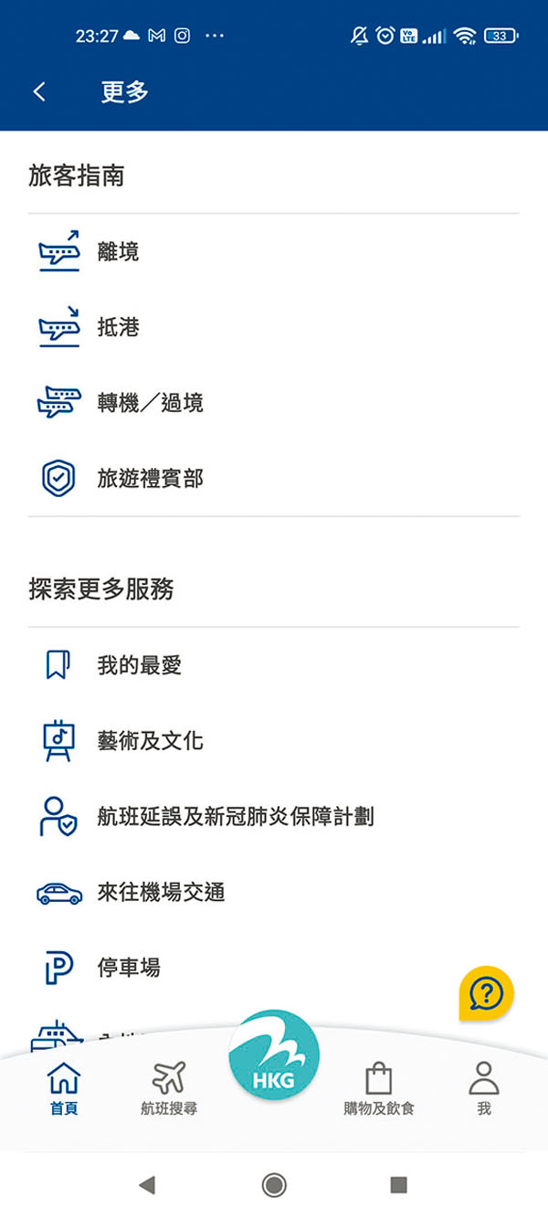 香港國際機場推出官方流動應用程式「My HKG」(前稱「我的航班」),讓您隨心所想體驗機場。「My HKG」提供實時航班資訊及通知,您亦可透過此應用程式預約機場服務及預訂餐飲,並提供機場導航功能,在抵達香港國際機場時更可自動連接機場的免費 Wi-Fi 。此應用程式亦設有聊天機械人功能,以即時訊息解答有關航班資訊、機場設施及購物餐飲的查詢。