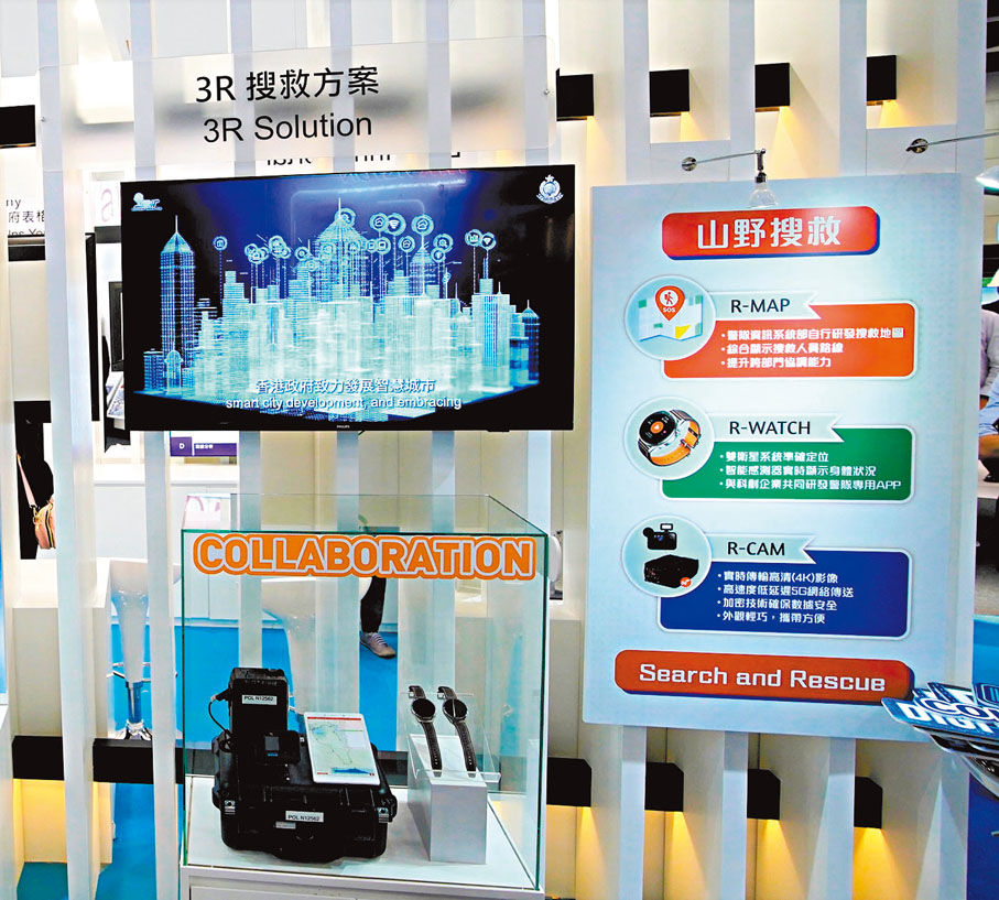 警務處展出其資訊系統部研發的「3R」搜救方案,該方案透過結合R-Map、R-Watch及R-Cam的綜合平台,利用實時地圖和衛星系統定位,提供搜救隊伍準確的位置,並把現場環境的高清影像傳送予指揮中心,以提升搜救效率,同時監察搜救人員的身體狀況,確保他們的安全。