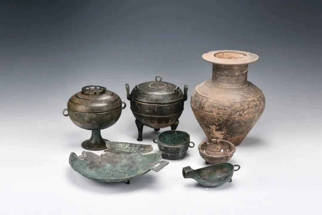 其中,兩座中型墓葬均為豎穴土坑墓,平面呈長方形,葬具均為一棺一槨。男性墓出土隨葬品36件(套),女性墓出土隨葬品10件(套),種類有青銅器、陶器、玉器、石器等。兩座墓中青銅器組合皆為鼎、豆、盤、舟、匜各一件。
