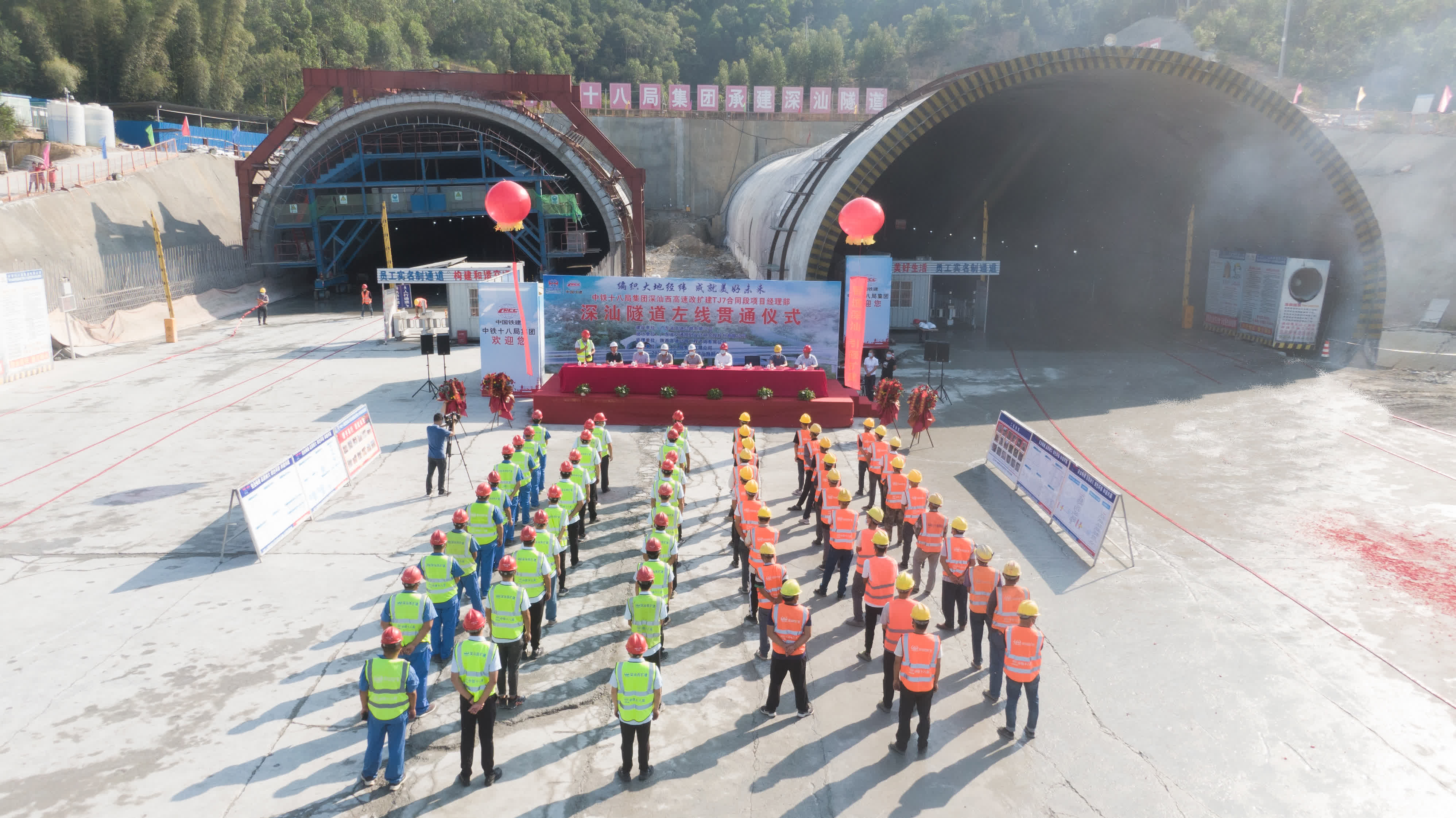 深汕隧道位於深汕特別合作區赤石鎮,為全國最大超大跨徑的暗挖山嶺隧道接明挖下沉隧道,雙線總長3542米,設計時速120公里每小時,雙向八車道。此次實現貫通的隧道左線全長1739米,最大開挖斷面達255平方米、最大開挖寬度達22.65米,洞口段偏壓淺埋、全隧道V級圍岩,施工難度大、安全風險高,為全線重難點控制性工程。