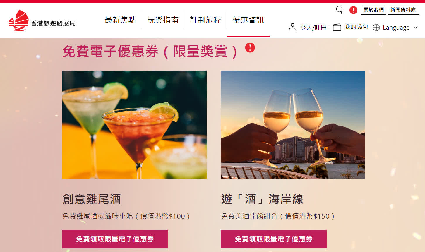 大公文匯全媒體報道:香港旅遊發展局於11月舉辦為期一個月的「香港美酒佳餚巡禮」,更將於明日(3日)上午10時起,派發首批2.5萬張美酒佳餚巡禮「電子優惠券」,供市民免費體驗「創意雞尾酒」及「遊『酒』海岸線」活動,品嘗雞尾酒或小食、以及指定美酒佳餚組合菜單。
