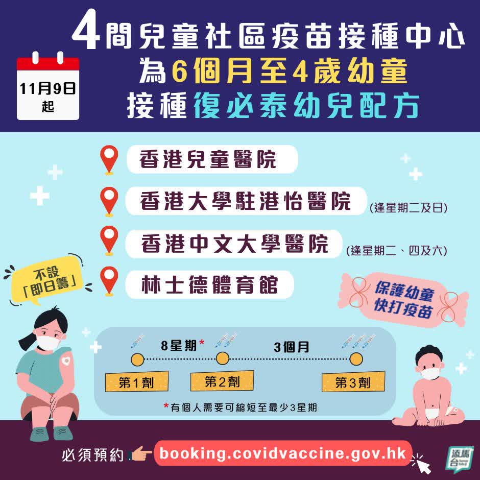 政府表示,由於復必泰幼兒和兒童配方均需特別稀釋程序,中心不設即日籌,家長必須預約接種。兒童抵抗力較弱,一旦不幸染疫可以非常嚴重,康復後亦可能出現中、長期後遺症。接種新冠疫苗可減低重症和死亡風險,為子女健康着想,把握機會盡快為他們安排打針。