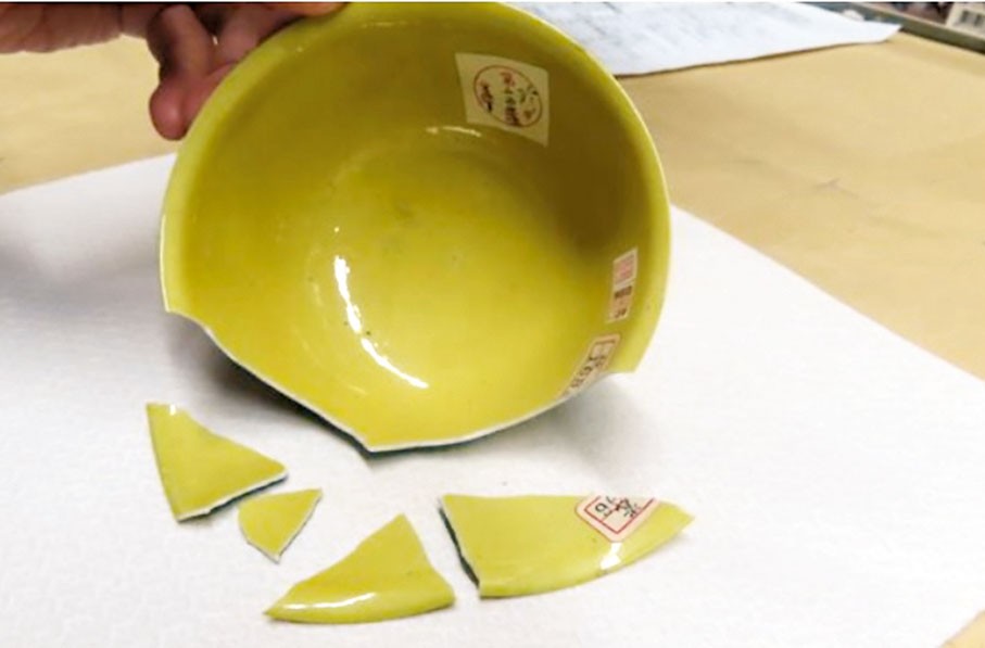根據台北故宮博物院新聞稿,2021年2月3日、2022年4月7日,器物處瓷器科人員整理文物時,打開文物包裹後發現「明弘治款嬌黃釉綠彩雙龍小碗」「清康熙款暗龍白裏小黃瓷碗」破損;2022年5月19日整理文物時,工作人員在作業過程中疏忽,致「清乾隆青花花卉盤」掉落破損。兩名涉事職員均被內部處罰。