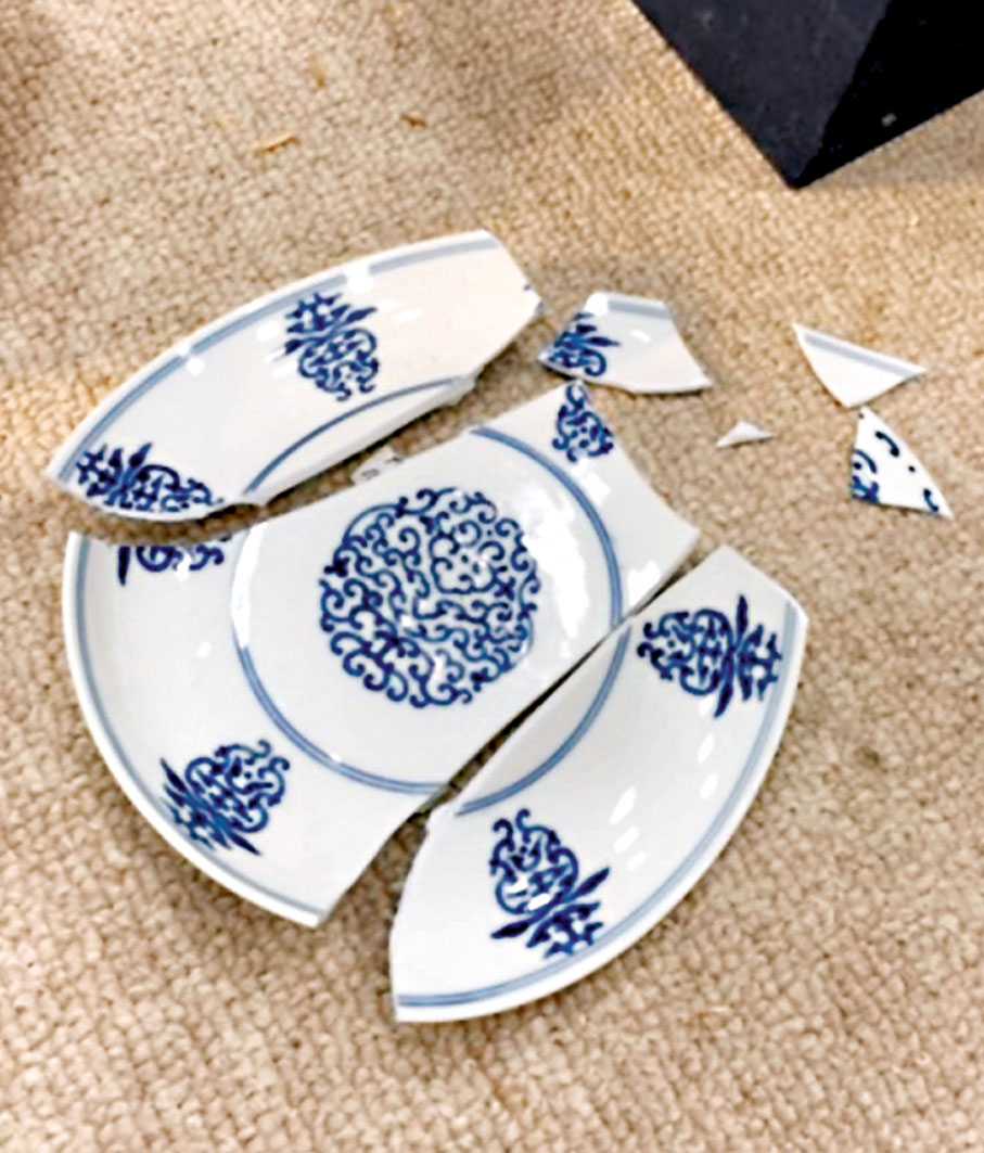 博物院應民代要求公布的一段視頻顯示,工作人員翻動藍布盒時瓷器不幸掉出,工作人員立刻接住其中一個,另一個瓷器掉落在地上。