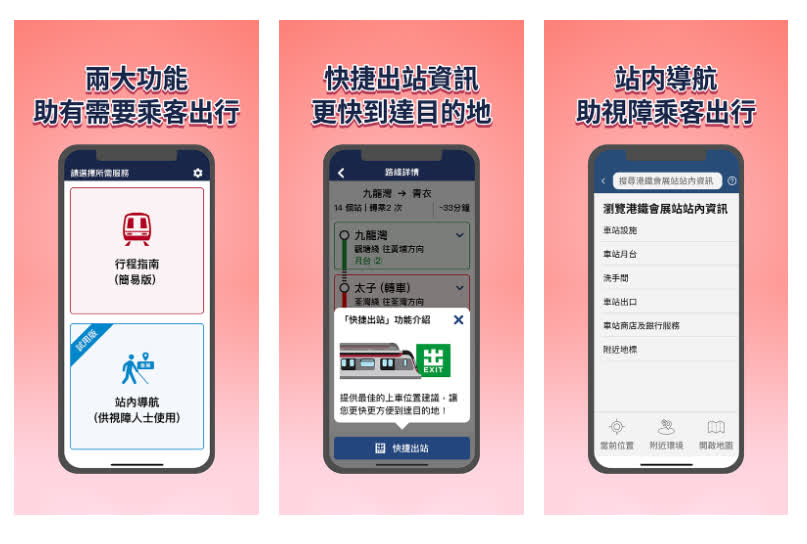 港鐵今起推出「關愛共乘」新手機App,率先於東鐵綫會展站試行的「站內導航」,用Wi-Fi定位技術協助視障人士掌握當前位置;另為長者特設簡易版行程指南。港鐵指,「站內導航」功能會擴展其他車站,初步每年在10個車站增設,該程式明年下半年會升級,新增預約輪椅活動摺板服務,為聽障人士提供非緊急求助服務,以及實時查閱車站升降機運作情況等。