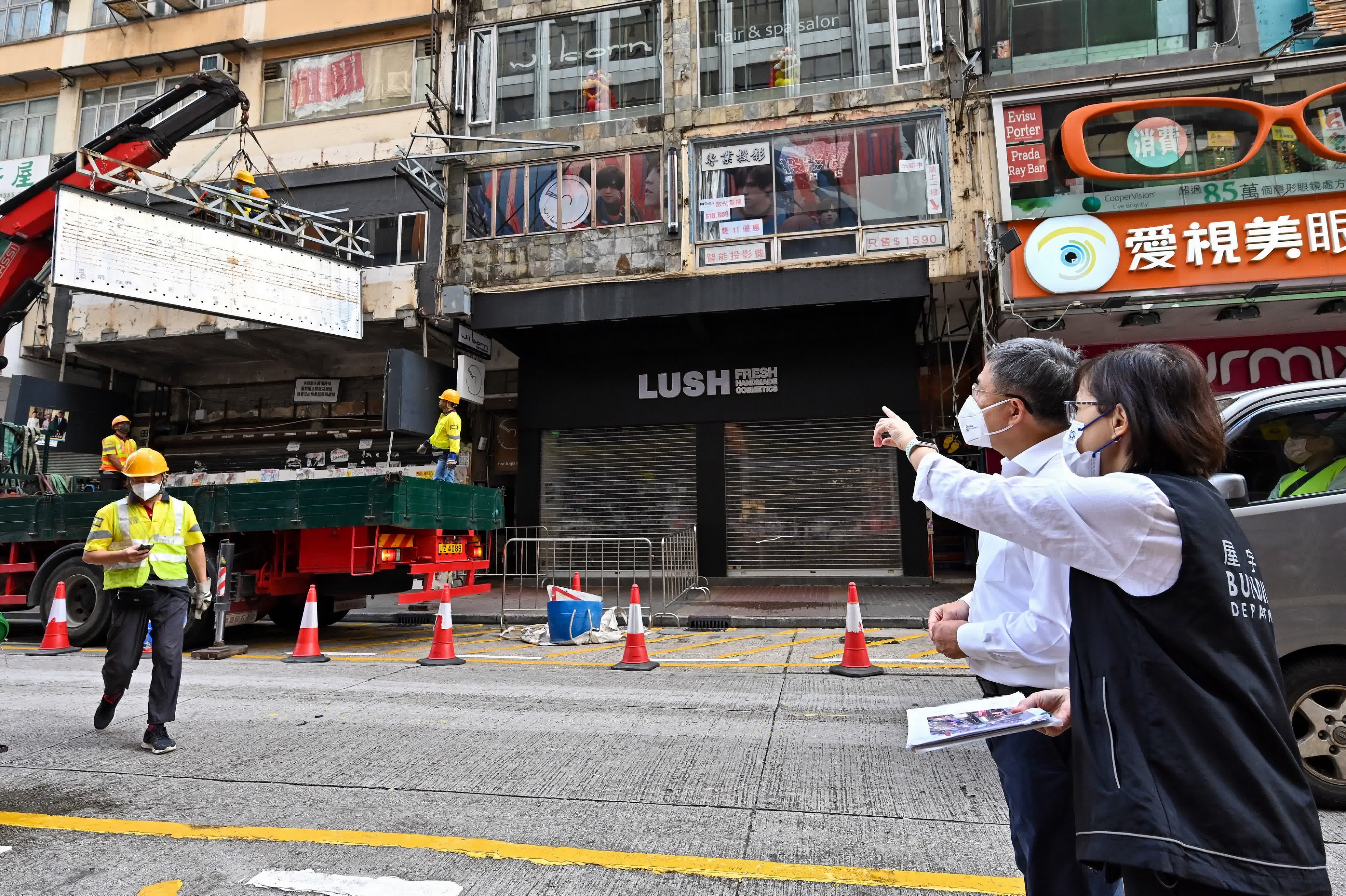 政務司副司長卓永興今早(15日)由屋宇署署長余寶美陪同到旺角視察清拆招牌行動,了解屋宇署處理危險及棄置招牌的工作。屋宇署早前跟進市民舉報,向西洋菜南街一大廈外牆的四個棄置招牌的擁有人發出拆除通知,因招牌擁有人逾期沒有遵辦,署方今早8時30分到場拆除。