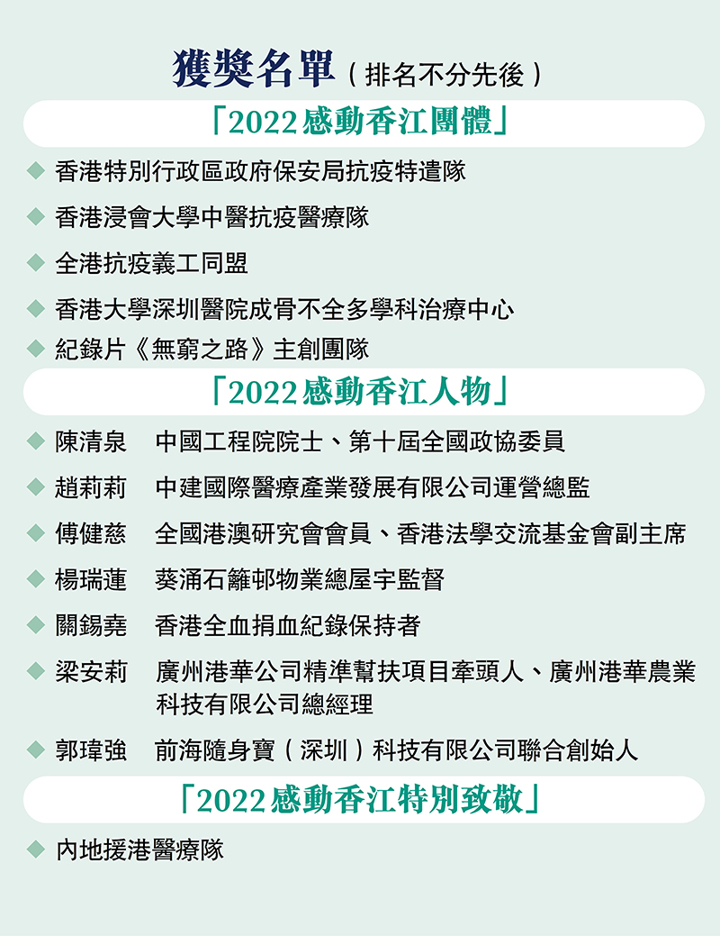 由香港大公文匯傳媒集團主辦、中聯辦青年工作部擔任特別支持機構的「慶祝香港回歸祖國25周年——2022感動香江評選活動」,自今年5月至7月向社會各界徵集提名,最終評選出3個類別共13個獎項,包括5個「2022感動香江團體」獎,7位「2022感動香江人物」獎以及「2022感動香江特別致敬」獎。