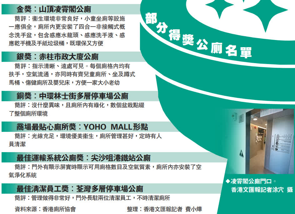 一如往年,廁所協會走訪全港十八區逾400個公廁作實地考察,今年奪得金、銀、銅獎的廁所分別為山頂凌霄閣公廁、赤柱市政大廈公廁及中環林士街多層停車場公廁。協會讚賞山頂凌霄閣公廁衞生環境非常良好,小童坐廁等設施一應俱全,廁所內更安裝了四合一非接觸式概念洗手盆,包含感應水龍頭、感應洗手液、感應乾手機及手紙垃圾桶,既環保又方便。