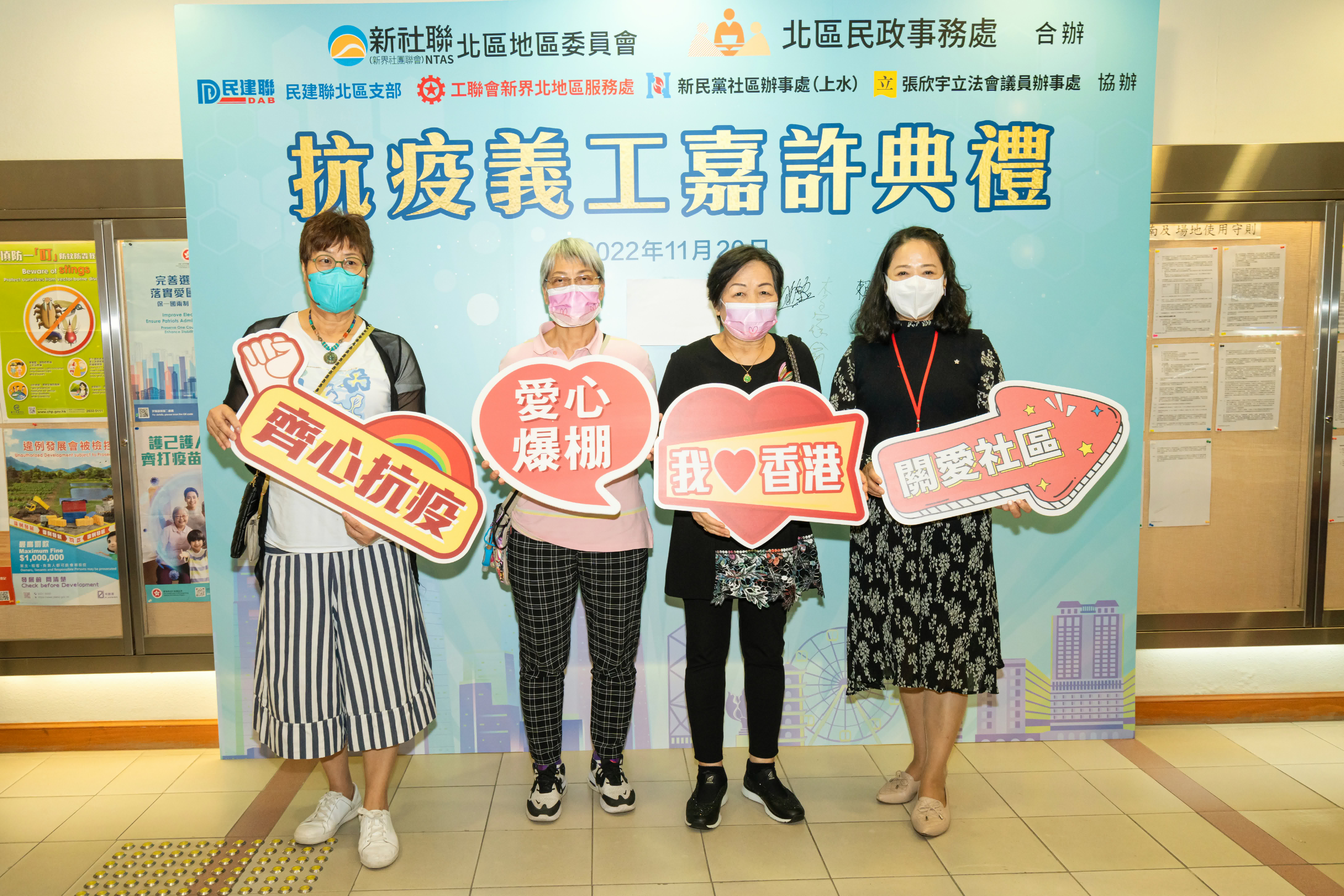 為表揚和感謝團體和義工們的付出,大會合共頒發1106張嘉許狀,邀請了中聯辦新界工作部副部長謝益明、北區民政事務專員莊永桓、新界社團聯會理事長陳勇、新民黨常務副主席黎棟國議員、立法會議員劉國勳、龍山分區委員會主席葉奕成、鳳水分區委員會主席朱浩賢、北區撲滅罪行委員會副主席侯金林及北區防火委員會主席李聖潑擔任頒獎嘉賓,為一眾抗疫義工嘉許鼓勵並頒發嘉許狀。