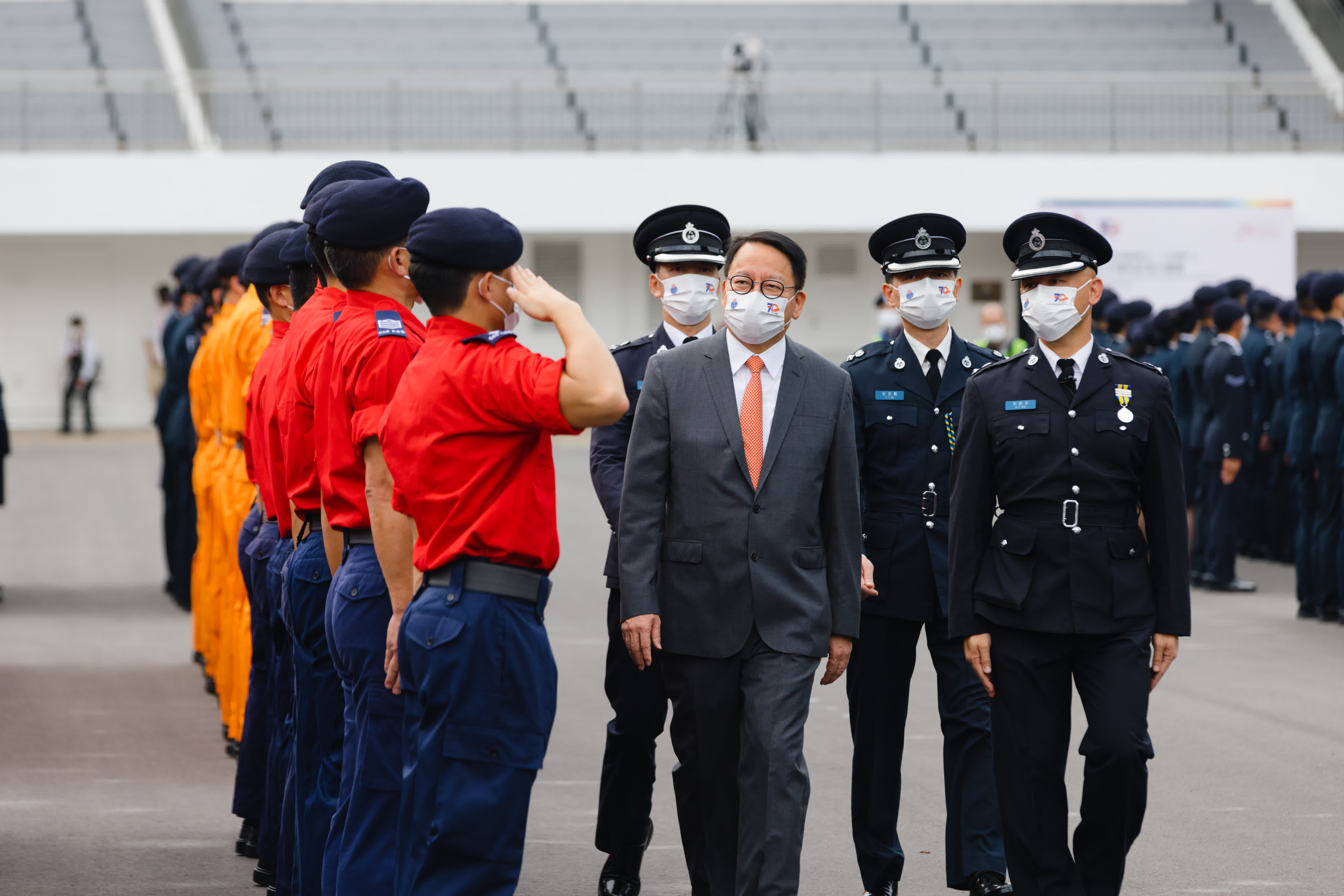 陳國基在致辭時表示,民安隊果斷執行各種救災任務,並在平日提供各類社會服務。民安隊致力保障生命財產安全的承擔,值得高度肯定,亦充分體現於在過去近三年香港應對新冠疫情的挑戰。民安隊肩負起管理多個檢疫中心、檢疫酒店和社區隔離設施的重任,為檢疫和隔離人士提供生活所需的適切支援。此外,民安隊近年開展「夥伴學校合作計劃」、「民盡其才計劃」、「多元種族專才計劃」等項目,為學生和多元種族人士提供紀律和領導才能訓練,培養他們成為擁有自信、善於溝通、懂得自律的公民。他指,展望未來,深信民安隊定當緊守崗位,為廣大市民解困、與廣大市民同行。