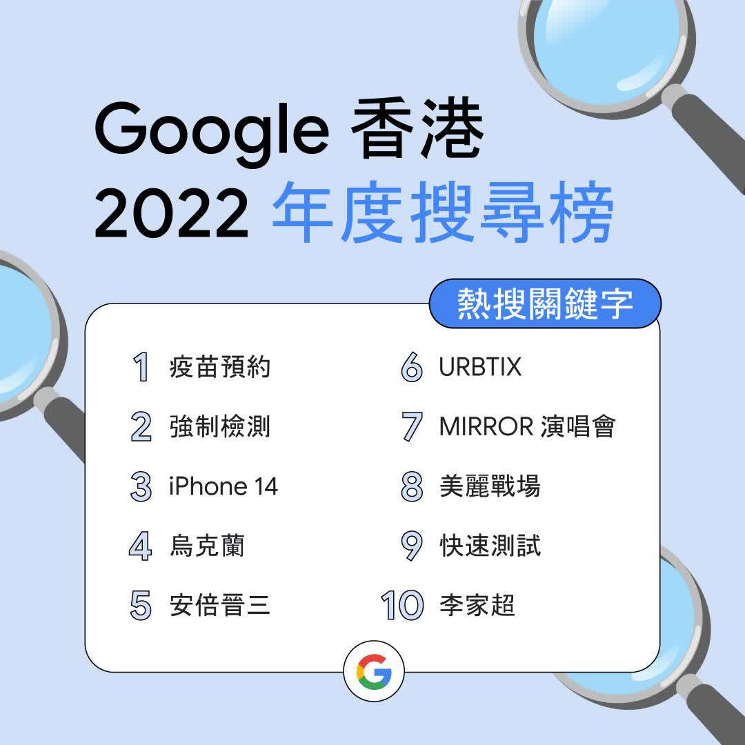 大公文匯全媒體報道:Google香港今日(7日)公布2022年度搜尋榜。由於今年疫情持續反覆,「疫苗預約」、「強制檢測」登上2022年度熱搜關鍵字首兩位,「iPhone 14」則緊隨其後。另外,今年7月上任的第六任行政長官李家超,登上熱搜關鍵字第10位。