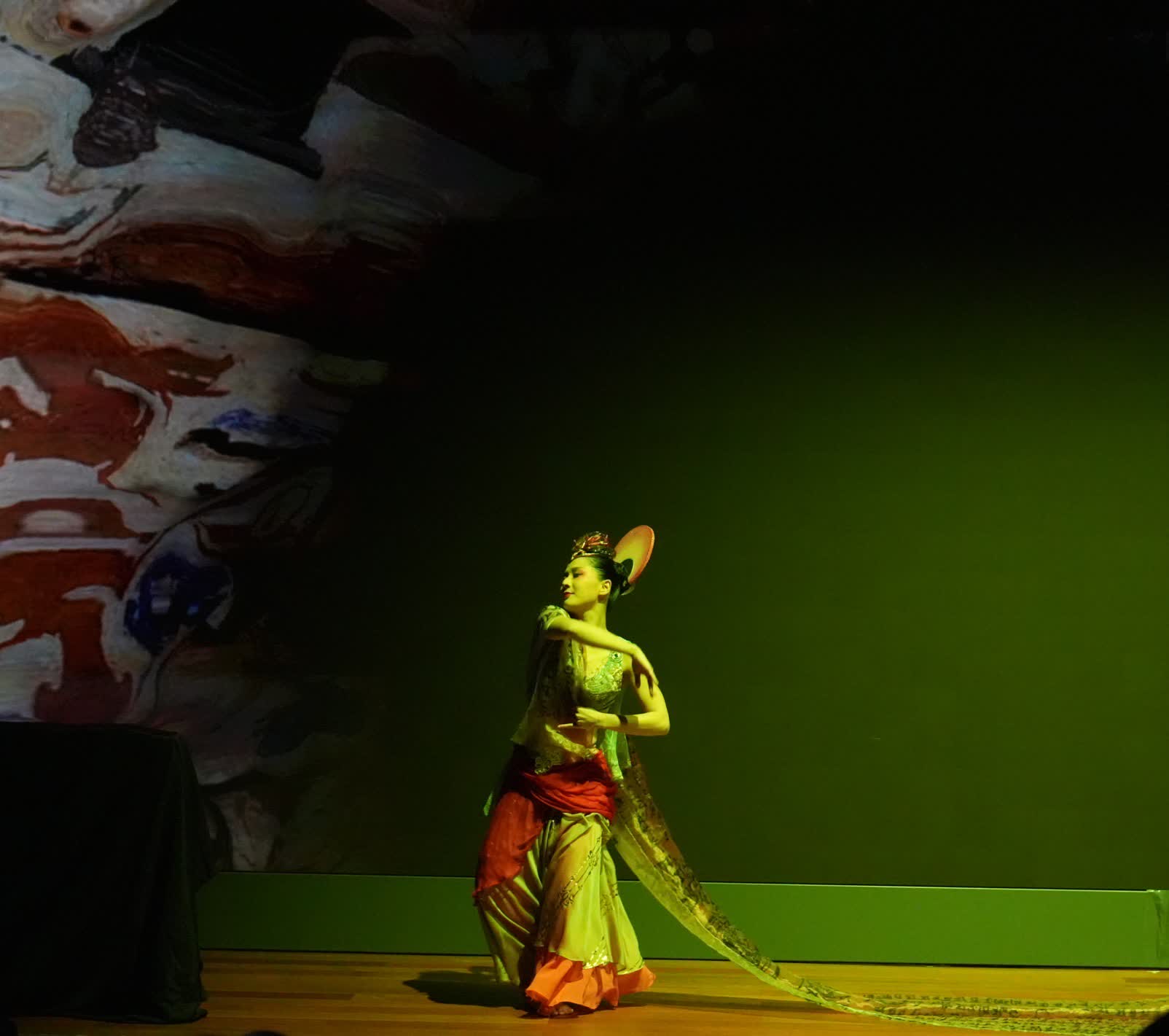 在香港舞蹈總會主辦的大型舞蹈劇《緣起敦煌》的視頻片段播放完後,兿人蔡頌思將著名舞蹈家陳磊為是次活動創作的全新獨舞《聞法飛天》作首次演出。