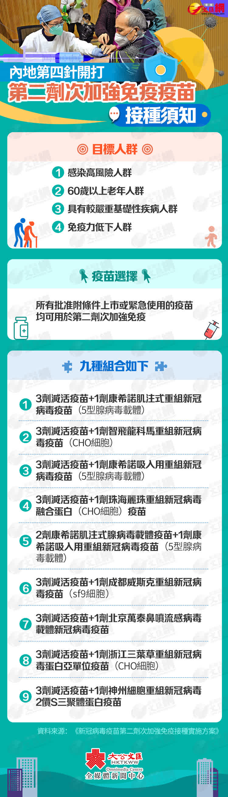 針對疫苗選擇和時間間隔,方案指出,所有批准附條件上市或緊急使用的疫苗均可用於第二劑次加強免疫。優先考慮序貫加強免疫接種,或採用含奧密克戎毒株或對奧密克戎毒株具有良好交叉免疫的疫苗進行第二劑次加強免疫接種。第二劑次加強免疫與第一劑次加強免疫時間間隔為6個月以上。