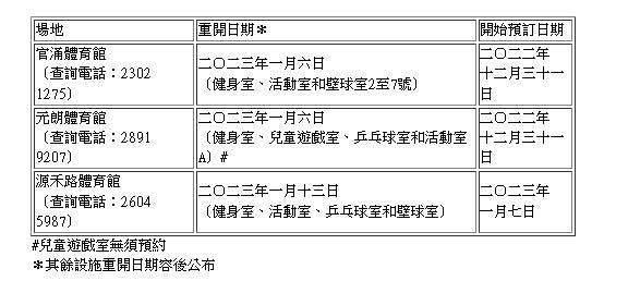 市民可於以下開始預訂日期起,使用康體通網上預訂服務、已重開場地的訂場櫃枱及自助服務站,或於當日起在辦公時間內到各分區康樂事務辦事處的訂場櫃枱預訂以下場地的重開收費設施:
