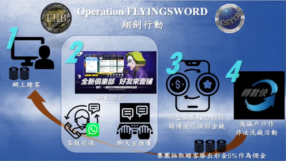 警方調查發現,自2019年4月起,該非法賭博集團以一間本地註冊公司運營手機應用程式,涉及包括麻雀、德州撲克等賭博遊戲,吸引賭客透過信用卡及虛擬貨幣充值點數,同時聲稱提供兌現服務,並利用客戶註冊用的電話號碼,主動聯絡玩家宣傳兌分服務。賭博集團會在每個賭局的優勝彩金中,自動收取5%作為佣金。