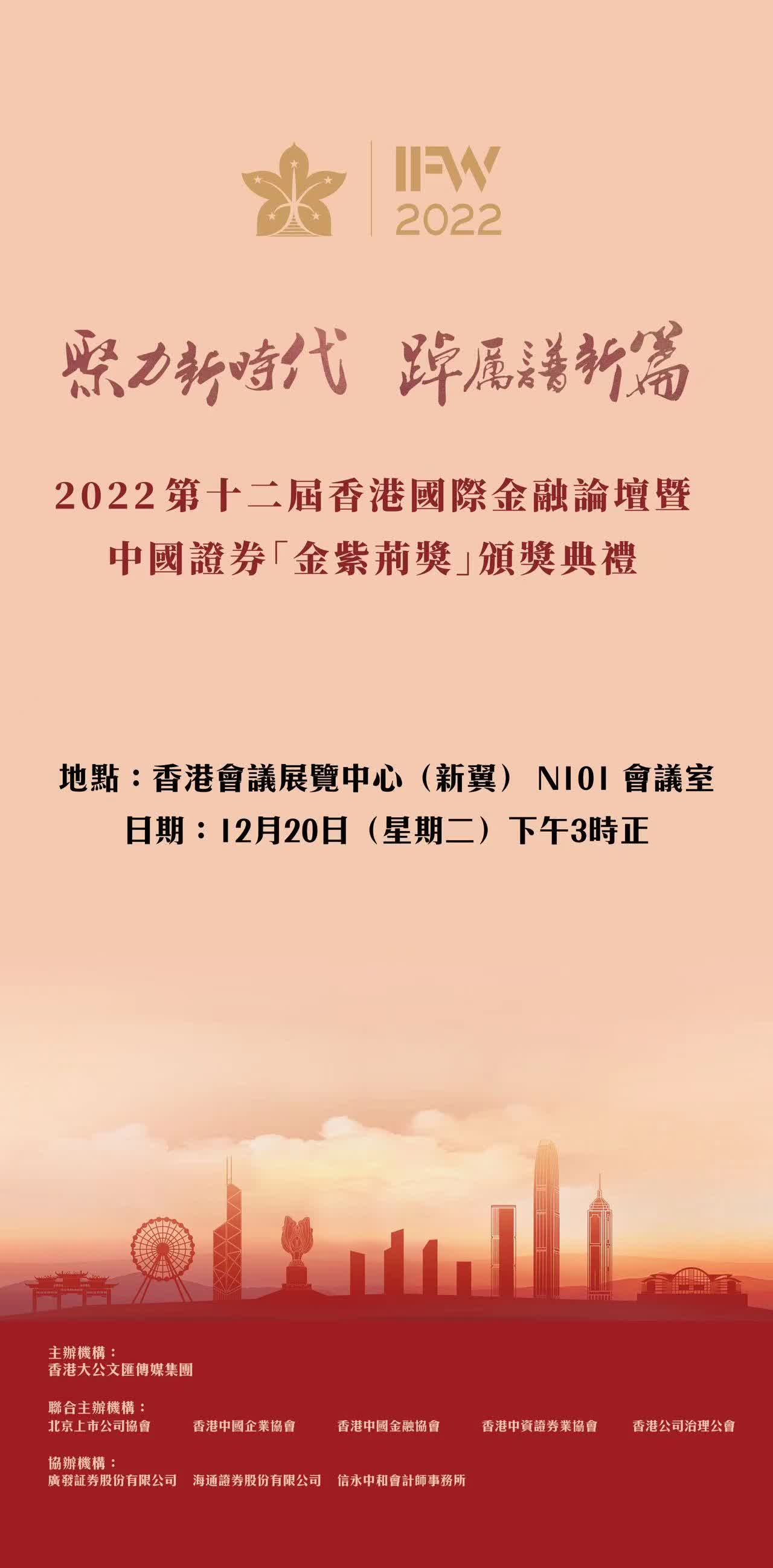 香港大公文匯傳媒集團聯合北京上市公司協會、香港中國企業協會、香港中國金融協會、香港中資證券業協會、香港公司治理公會共同主辦的2022第十二屆香港國際金融論壇暨中國證券「金紫荊獎」頒獎典禮將於12月20日在香港會議展覽中心隆重舉行。