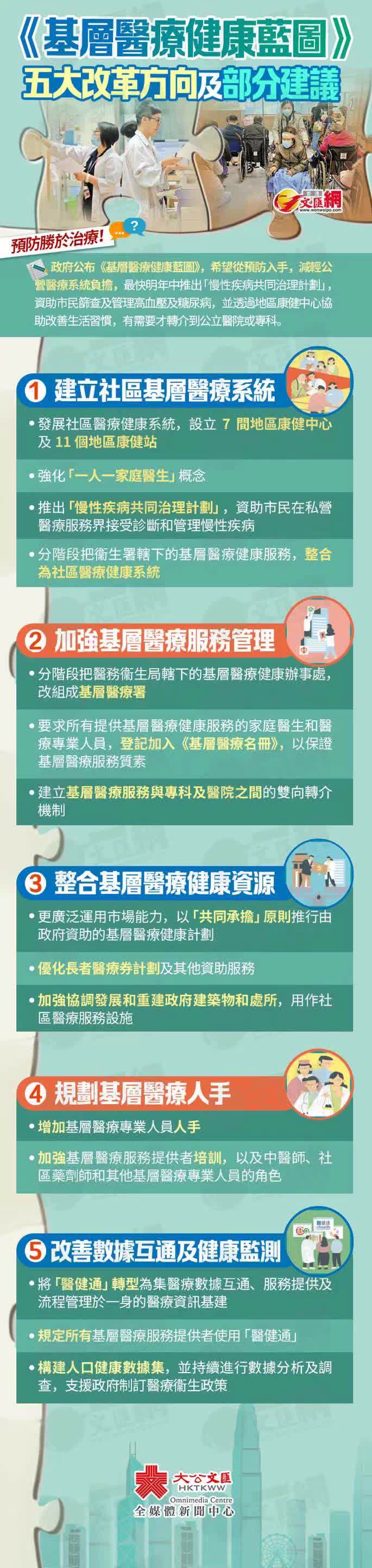 藍圖提出五大基層醫療健康改革方向,包括建立社區基層醫療系統、加強基層醫療服務管理、整合基層醫療健康資源、規劃基層醫療人手及改善數據互通及健康監測。
