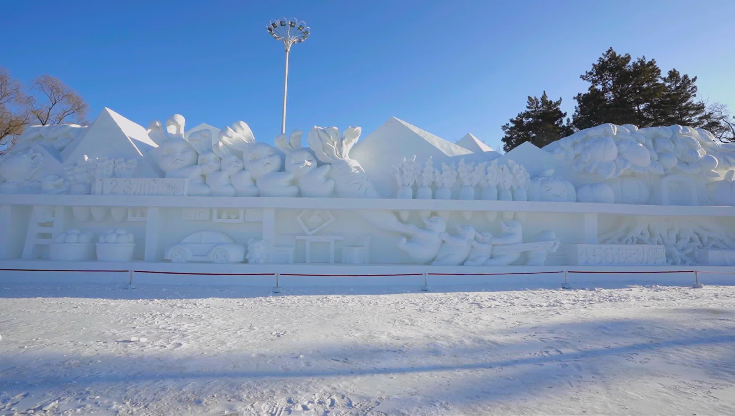本屆雪博會主雪塑《逐夢》長100米、高33米,由70位雕刻師歷時近10天完成,用雪量2.6萬立方米。以敦煌飛天少女為原型,結合中國航天元素,穿越歷史長河,踏雪而來,表達了全國人民共同奔向幸福未來的美好憧憬。