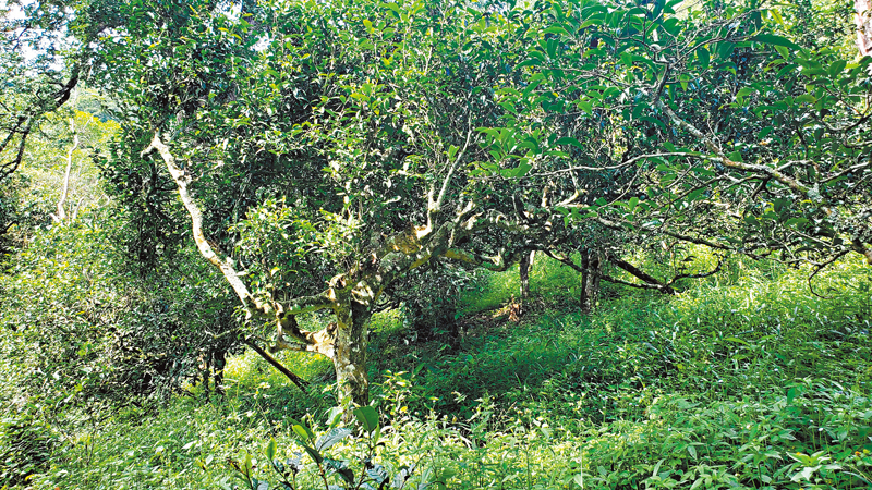 走離布朗人竹樓不遠,我們就進入了一片深不可測的古茶樹林。陪同說這是竹林寨的古茶園,竹林寨有古茶園1,200畝。竹林寨古茶園連着半坡寨古茶園,半坡寨古茶園有3,700畝之多。兩寨的古茶園連在一起,形成了西雙版納甚至所有普洱茶區最為廣闊、最具古韻的古茶園。在竹林寨古茶林中穿行,好似走進了茶樹的迷宮。我邊走邊看那些古老得彎腰曲背但又頑強不屈的老茶樹,深深感到了歷史的滄桑和生命的可貴。坡越來越陡了,陪同說這表明我們正邁進半坡老寨的古茶園了。古茶樹生長的斜坡都比較陡,下面盡是些枯枝爛葉,走起來很費勁,許多地方只能「爬」,甚至必須手足並用。半坡老寨的古茶樹比其他寨子的更顯得老而彌堅,不少古茶樹上碗口粗的叉枝彎來盤去長成一個個圓圈。陪同說一個樹圈要200年才長得成,這樣看來,那圈就不是簡單的樹圈,那等於是記載南糯山歷史的U盤。有些高大的古茶樹上架着採摘茶葉時搭的木梯或架樁。古茶林中有不少高大的喬木一樹擎天,好似守護這片千年茶樹的衛士。據陪同說,茶樹有高大喬木混生,茶性中才含明顯的野韻。在歷經數百年歲月磨礪的古茶樹間行走,看着盤根錯節、滄桑遒勁的古茶樹,才真正感受到了幽遠古樸的茶韻。新芽與老葉共生,茶花與茶果齊長。斑駁的樹幹上,布滿不計其數的寄生苔蘚。茶林中的鳥窩,儘管粗糙簡陋,卻日日夜夜吸吮天地之靈氣、披戴日月之光華。