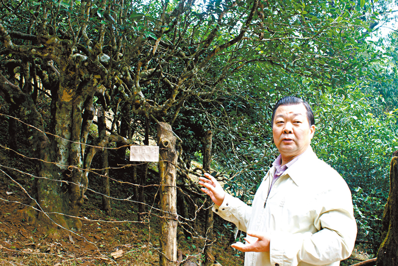看着新茶王樹,我不由想起陪同介紹過的老茶王樹。老茶王樹也生長在半坡老寨,由雲南省茶科所研究人員於1951年12月發現。樹高8.8米,主幹直徑0.83米。經國內茶葉界許多專家學者進行多學科綜合考察論證,最終根據樹形以及哈尼族的世居民族年份推斷,茶王樹樹齡達800多年,屬栽培型「古茶樹王」。這是我國有茶史以來,第一棵有年份紀元的茶樹。這棵純粹栽培型800年茶王樹的發現,證明了「中國是茶樹的原產地,也是最早利用茶樹的國家」,意義非同一般。1990年12月,全國政協副主席、全國佛教協會會長趙樸初親臨南糯山參拜「茶王樹」後,欣然揮毫留下墨寶「南行萬里拜茶王」。可憐的是,這棵茶王樹雖經800年風雨歲月,從宋代至今都能傲然挺立,卻終究經不起現代人的商業操作和旅遊折騰,不幸於1995年枯死。近千年的輝煌,到如今連那截枯幹都不復存在,只留下一個土洞,供後人想像憑弔,徒讓人唏噓悲嘆!