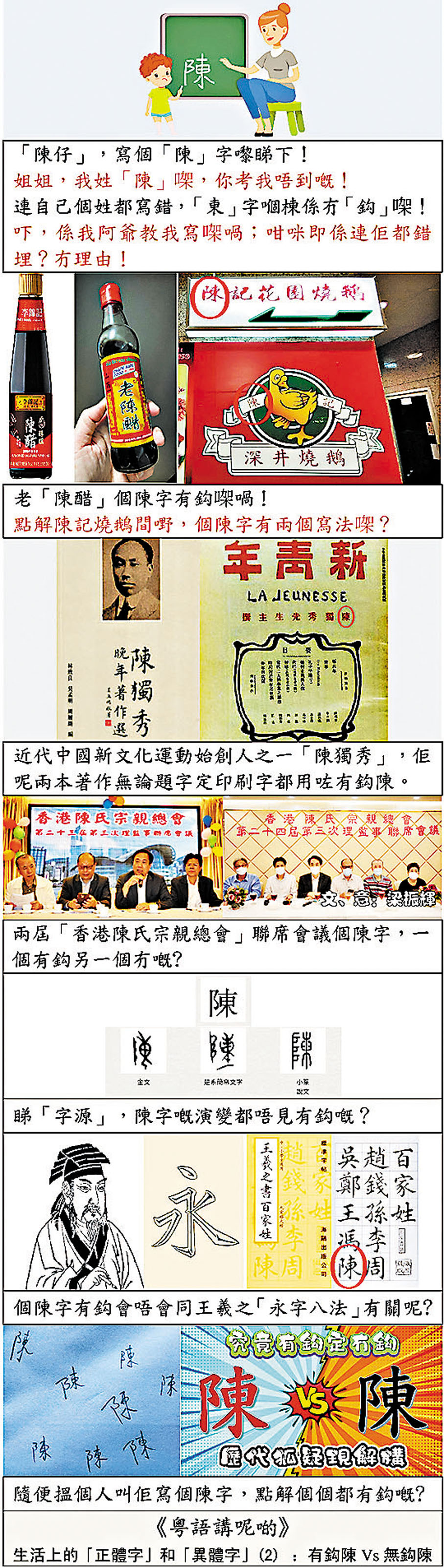 「陳」係中國人,尤其廣東人嘅大姓;「陳」字如果冇隻「鈎」,邊得嚟咁有氣勢呀?王羲之嘅「永字八法」之所以震驚古今書法界,或多或少同「永」字嗰隻「鈎」有關。可能係咁,王羲之寫《百家姓》個「陳」嗰陣都用咗有「鈎」嗰款,於是乎就搞到你跟、我跟、個個跟!