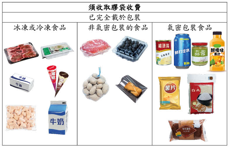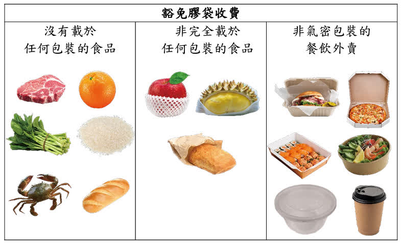 政府表示,只有購買沒有包裝或並非完全載於任何包裝的食品,或購買以非氣密包裝的餐飲外賣,才可獲免費提供塑膠購物袋,並以每單一交易一個免費袋為基本原則。(如首個免費膠袋未能盛載所有食品、只用一個膠袋可能會令膠袋破損,或把多種食品放在同一免費膠袋會令食品的品質受損,則可額外提供一個或多個免費膠袋。)
