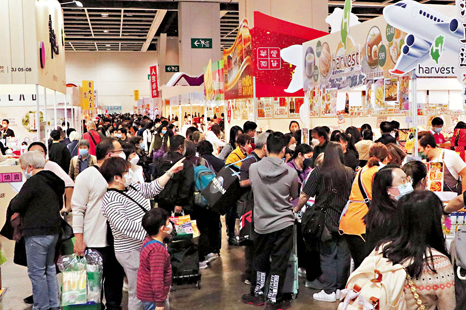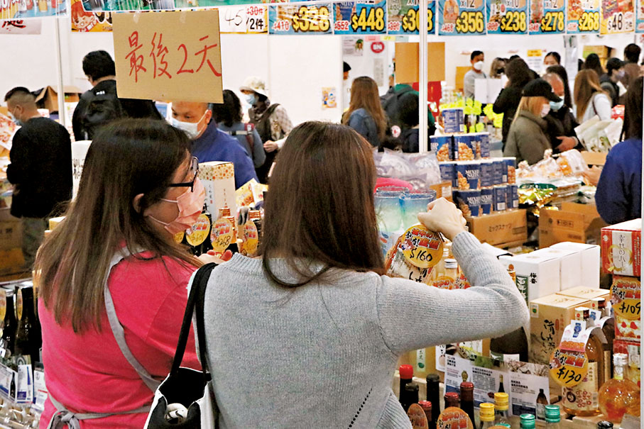 香港文匯報訊(記者 張弦)昨日是聖誕假期最後一天,不少市民把握機會繼續遊玩和消費,市面熱鬧非常。其中,工展會和冬日美食節湧現大批人潮掃平貨。香港文匯報記者昨日下午前往冬日美食節展覽訪察,現場人聲鼎沸,不少市民一家大小拖着車仔掃貨,攤位推出大量優惠吸引顧客,個別通道更被搶購心頭好的市民圍到水洩不通。有市民買滿一架手推車的貨物才花費幾百元,形容平過工展會。不過,有參展商表示「旺丁不旺財」,銷情比今年8月類似展覽遜約五成,認為與港人外遊及市民已經用完消費券有關。