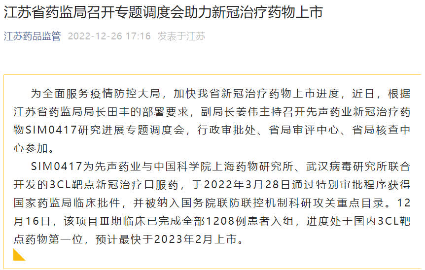 江蘇省藥監局先前召開SIM0417研究進展專題調度會,公告顯示,SIM0417為先聲藥業與中國科學院上海藥物研究所、武漢病毒研究所聯合開發的3CL靶點新冠治療口服藥,於2022年3月28日通過特別審批程序獲得國家藥監局臨床批件,並被納入國務院聯防聯控機制科研攻關重點目錄。本月16日,項目三期臨床已完成全部1208例患者入組,進度處於國內3CL靶點藥物首位,料最快明年2月上市。