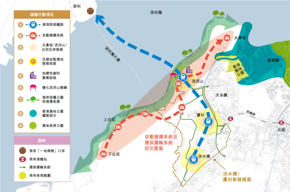 現時,港深西部鐵路(洪水橋至前海)項目的首階段研究工作已完成,確立了項目的策略價值和必要性,並擬定項目的初步可行方案。項目將連接洪水橋/厦村新發展區至前海,加強香港北部都會區與廣深科技創新走廊的銜接,配合公路網絡,使兩地聯合成為珠江東岸交通走廊的策略性樞紐。
