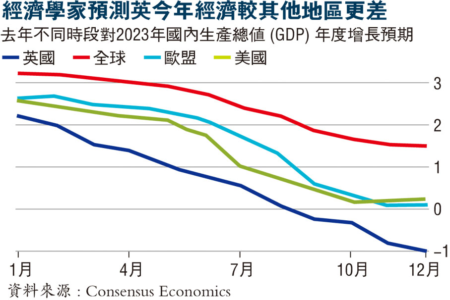 儘管許多經濟學家預計英國經濟將從今年底開始出現微弱復甦,但脫歐和投資增長疲弱的影響,預料將影響英國長期經濟表現,降低其增長前景和生活水平。新冠疫情和俄烏衝突造成的通脹衝擊,在英國的持續時間將比其他地方更長,這將迫使英倫銀行維持高利率,並實施緊縮財政政策。
