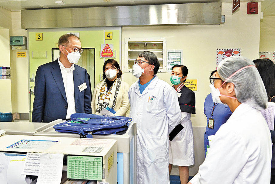 另外,醫務衞生局局長盧寵茂昨日巡視伊利沙伯醫院急症室、經改裝接收新冠病人的普通病房及隔離病房,並聽取醫院管理層和前線醫護講述服務情況及人手調配。盧寵茂表示,公立醫院正處於冬季服務高峰期,加上近日天氣寒冷,新冠病毒和流感等呼吸道感染個案數字持續高企,經急症室求診人數及需要入住公立醫院的人數顯著上升。對此,醫管局開設臨時病床及作出人手安排,加強高峰期間的病人服務,同時亦增加遙距診療和藥物派遞等服務,減輕公立醫院承受的壓力。