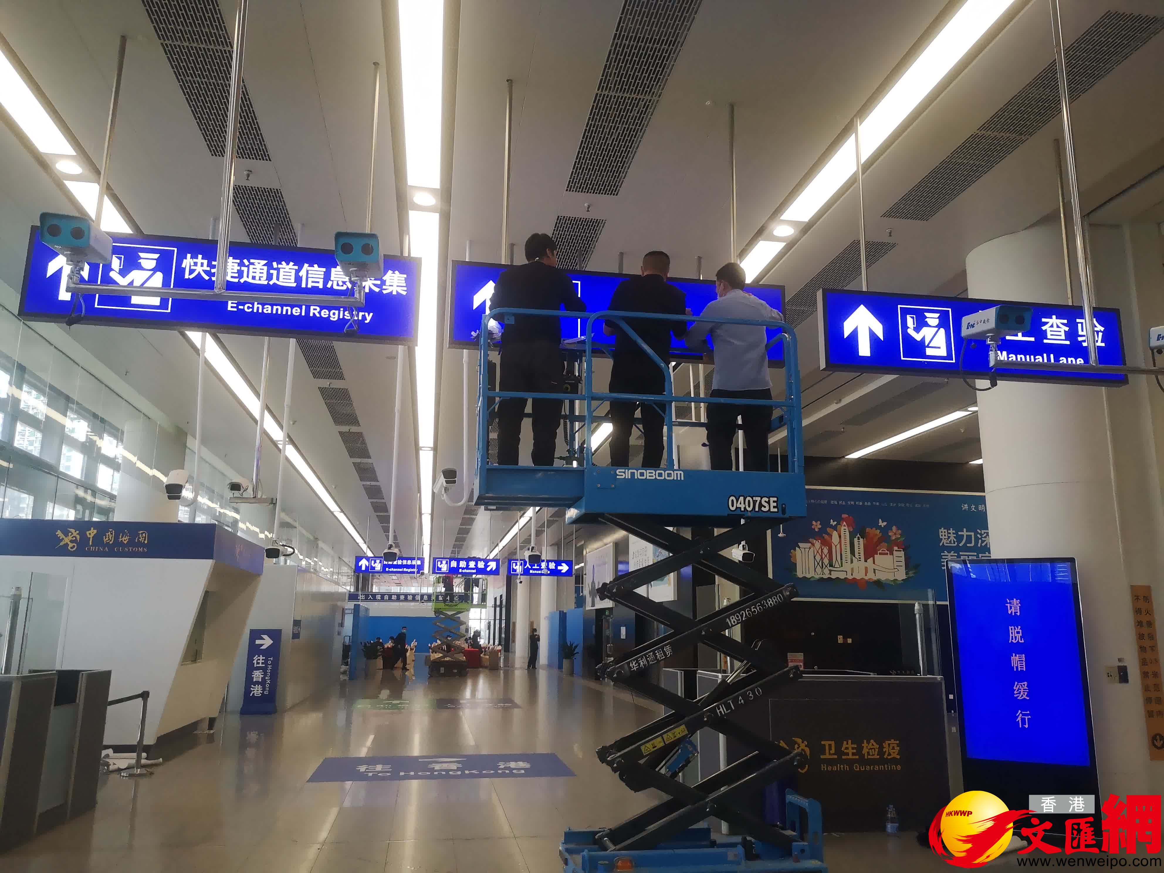 (香港文匯網記者 石華 深圳報道)6日,記者在探訪福田口岸時了解到,通關指引和標識牌正在做最後安裝,口岸出入境大廳將開足通道。