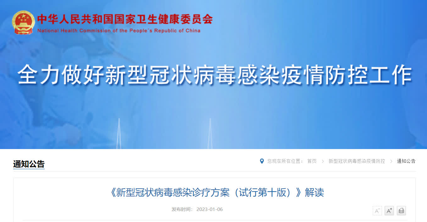 國家衞生健康委、國家中醫藥局今天(1月6日)印發《新型冠狀病毒感染診療方案(試行第十版)》。