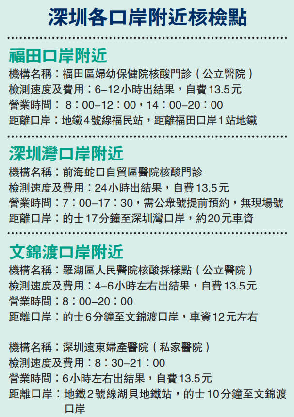 (香港文匯報記者 郭若溪 深圳報道)香港與內地8日起實施首階段通關後,港人從內地返港亦需要48小時核檢陰性證明,並將檢測結果填入內地海關健康申明卡。香港文匯報記者6日走訪發現,多家醫院都在核檢門診外設置了核檢自助繳費機,以方便未預約的市民便捷掛號,但港人持回鄉證無法使用該機器繳費,還另需到門診窗口進行人工掛號。此外,由於深圳目前常設核酸檢測點數量較此前大大減少,地點分散,部分醫院核檢門診還需提前預約才能去做。目前,多家三甲醫院資源緊張,區級醫院則排隊人數較少,為避免現場撲空,在「深圳衞健委」微信公號能夠查詢到全部信息,港人可以預先查詢後再前往。單人單管核檢最快4小時有結果,自費13.5元人民幣。