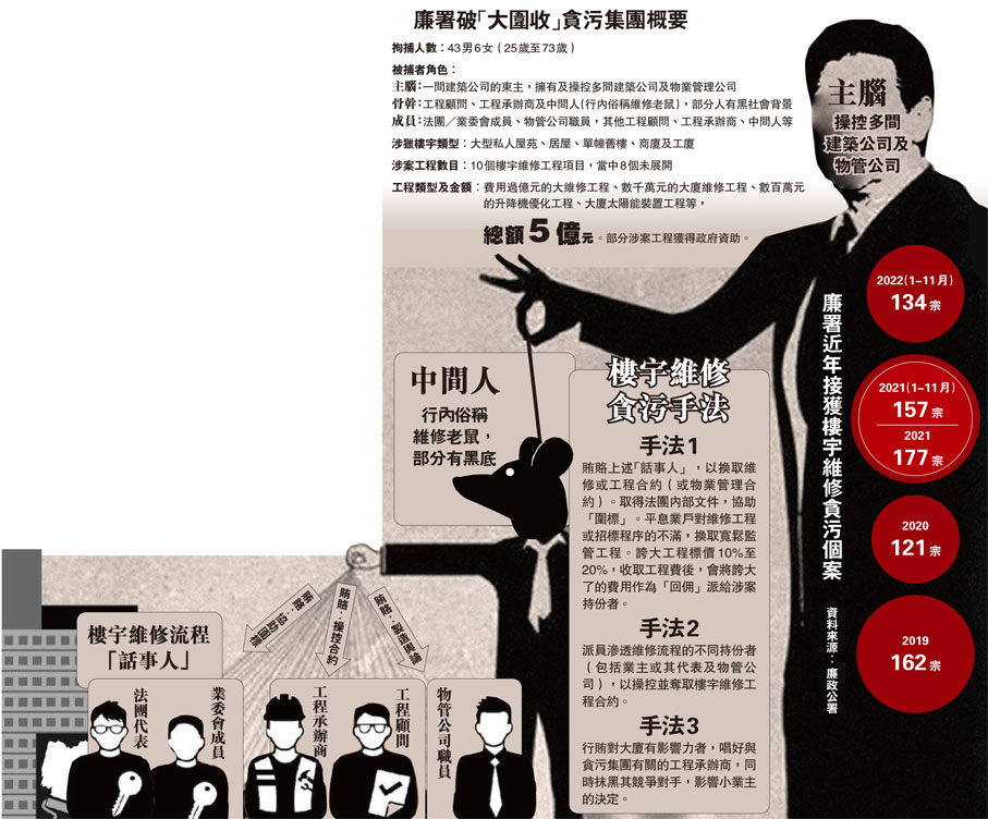 (香港文匯報記者 蕭景源)香港廉政公署日前憑一名市民的投訴舉報,於廉政行動中揪出一個大型樓宇維修貪污集團。廉署於1月4日展開代號「火網」行動,出動300人拘捕49名「大圍收」貪污集團成員,包括建築公司東主、工程顧問、工程承辦商及俗稱「維修老鼠」的中間人,以及法團主席、物管公司職員等維修工程持份者,涉及10個樓宇維修工程合約,金額總值超過5億元,個別項目涉過百萬元賄款。調查發現,貪污集團以中間人向各持份者行賄打通關節,串謀奪取樓宇維修工程合約的招標,並抬高工程費用10%至20%,作為受賄法團成員及其他持份者的「回佣」,及換取工程監督「手下留情」。換言之,業主不但支付高昂維修費,維修質量也難以得到保障。